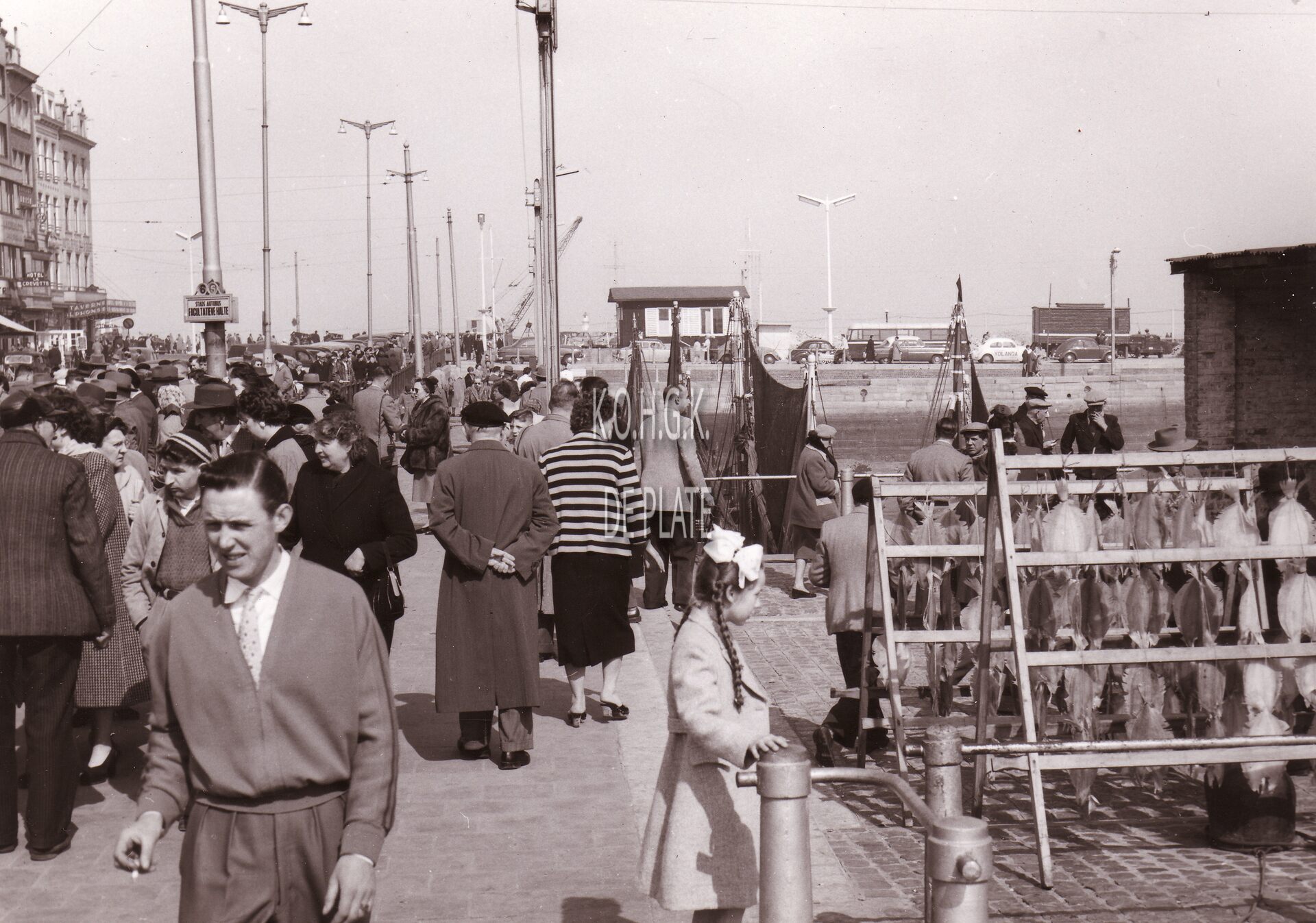Formaat : 13 x 18 cm. - Drukte langs de Visserskaai. Rechts een rek met droogvis (Schotse Schullen).