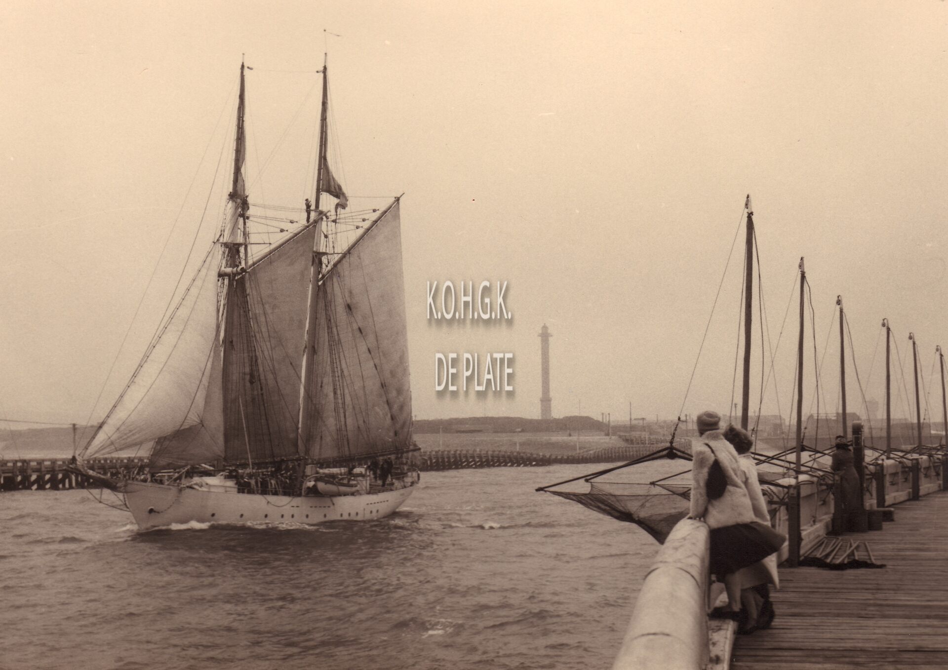 Formaat : 13 x 18 cm. - Een zeilschip vaart de haven uit.