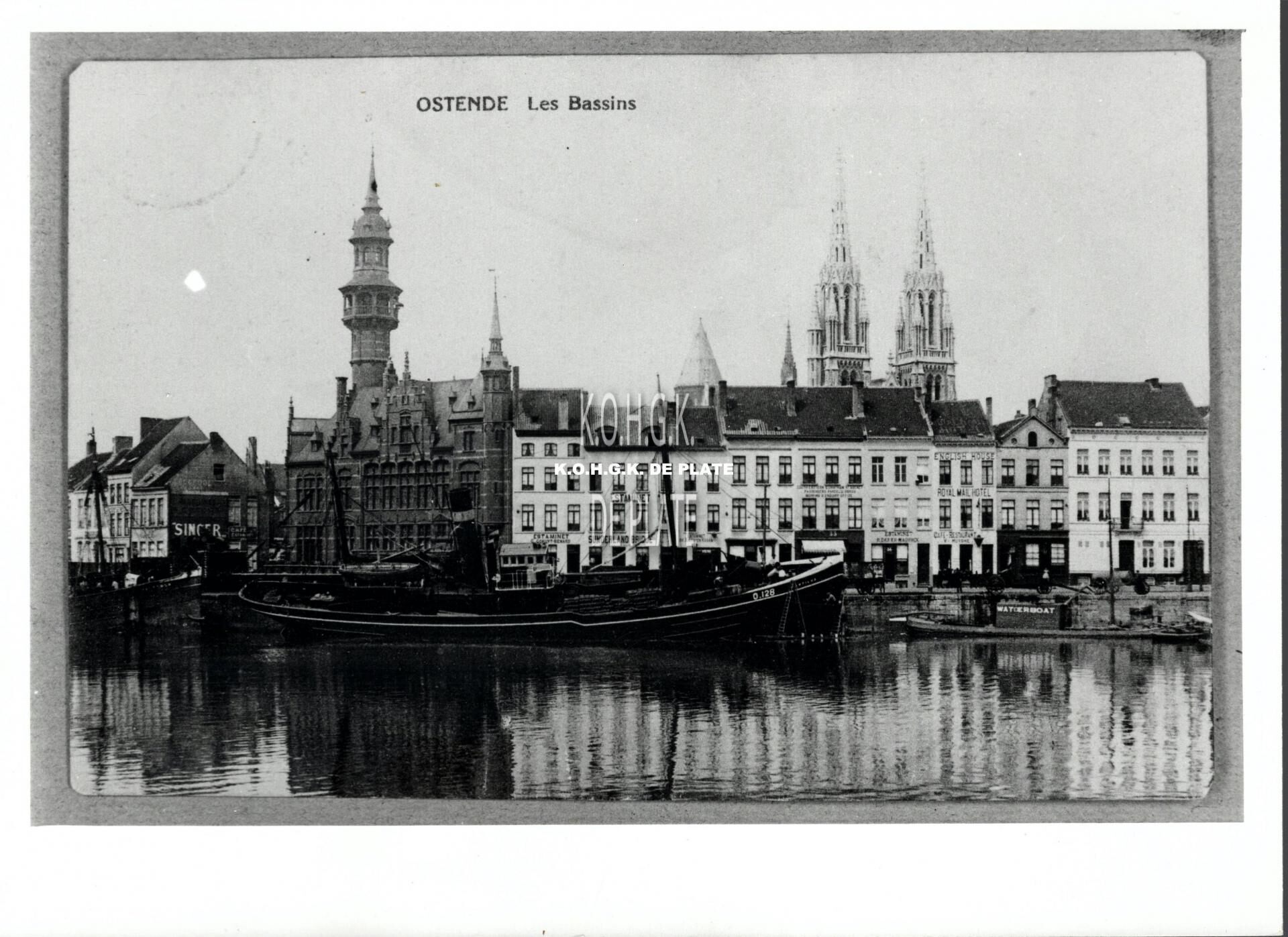 V.l.n.r. : Het Zeevaartcommissariaat ; Estaminet G. Comuyt-Benard : Estaminet Sunderland Bridge ; ? ; het reisagentschap South Eastern & Chatham Railways ; Estaminet Defer-Maurickx ; English House Royal Mail Hotel / Café Restaurant V. Huyghe ; ? ; ?. In de achtergrond de kerktorens van de Sint Petrus en Pauluskerk en de Peperbusse