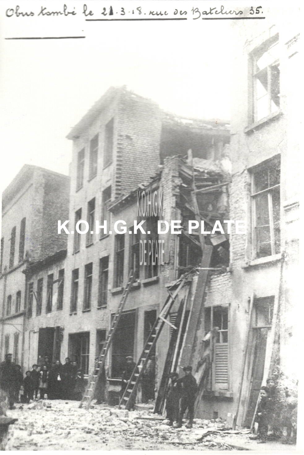 Formaat : 12,5 x 8,5 cm. - Obus tombé le 21-3-18. rue des Bateliers 35. - Tijdens de beschietingen van 21 maart werden in de Schippersstraat de woningen nr. 33, 35, 37, 46, 48, 50, 62 zwaar beschadigd of vernield. Hier woning nr. 35.