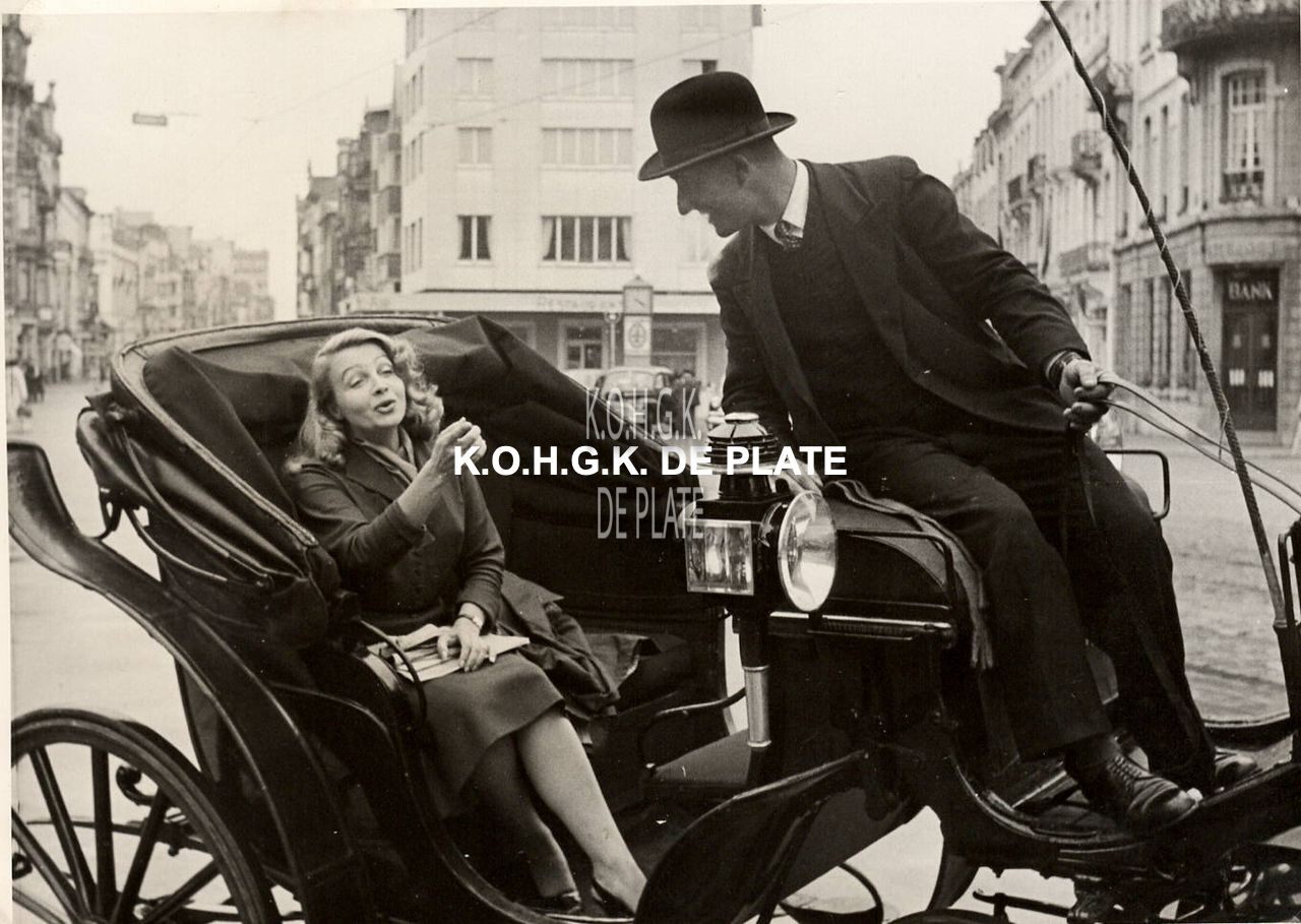 Formaat : 13 x 17,5 cm. - Voor de ingang van het Kursaal, Elfie Mayerhofer in gezelschap van een Oostendse koetsier. Rechts, de Langestraat en links, de Van Iseghemlaan