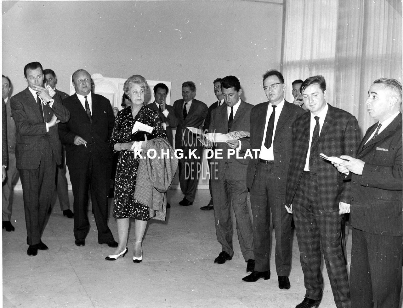 Formaat : 18,5 x 23,5 cm. - De vernissage op 8 augustus 1964. Schepen Raymond Miroir (rechts) opent de tentoonstelling. Naast hem, de kunstenaar, Frank Edebau, stadsconservator, Marcel Friederichs, gemeenteraadslid... Achteraan, tussen de kunstenaar en de stadsconservator, een glimp van Omer Vilain, stadsbibliothecaris. Tentoonstelling met o.a. een assemblage van poppen, stoelen en andere meubelfragmenten.