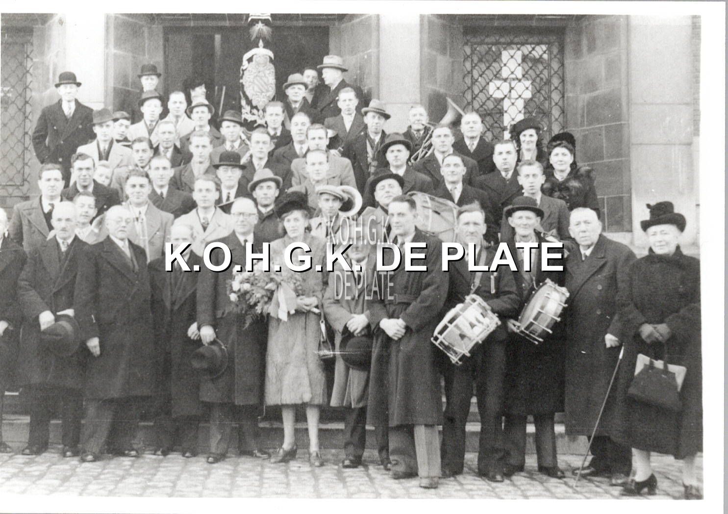 Formaat : 9 x 12 cm. - De fanfare met vaandel op de trappen van het Gerechtshof (toen diensdoend als stadhuis). Ontvangst ter gelegenheid van het 50 jarig lidmaatschap van Arthur Vanhoutte, Evarist Vandenbroele, Karel Deschacht en Constant Schotte. De mevrouw met de bloemen is de echtegnote van Arthur Vanhoutte. Links naast haar, burgemeester Henri Serruys. Uitgebreide beschrijving in : Zo was Mariakerke : deel II / Marc Casier. 2010, p.311. Plate Bib A321