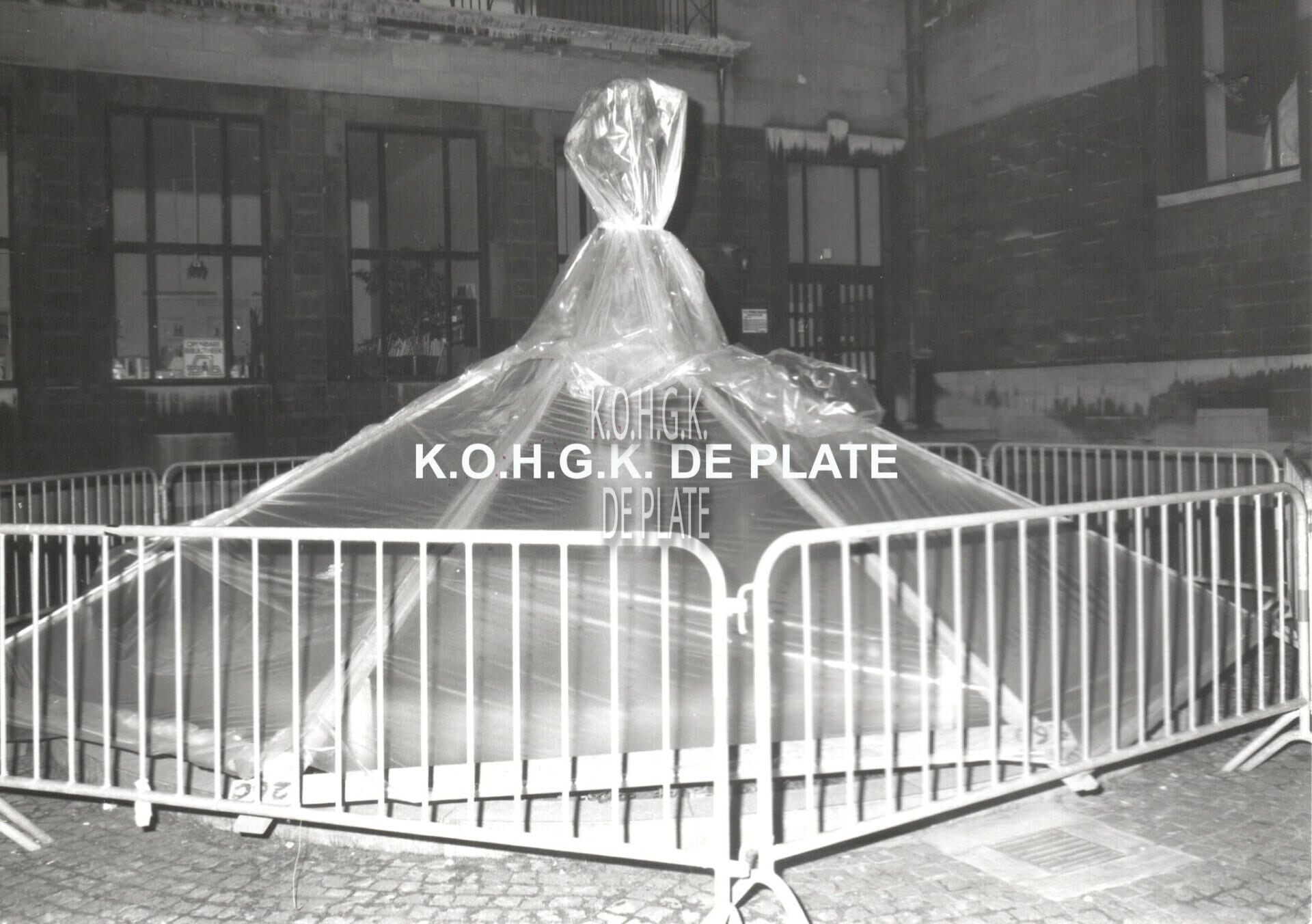 Formaat : 18 x 13 cm. - Binnenkoer van het Feest- en Cultuurpaleis, Wapenplein. Voorbereidingswerken voor het waterdicht maken van het vijvertje. De Zeemeermin van beeldhouwer Willy Kreitz ingepakt. Op de achtergrond de jeugdafdeling van de stadsbibliotheek, met rechts de ingang. Na de renovatie van het gebouw verhuisde het beeld naar de oever van de vijver in het Leopoldpark.