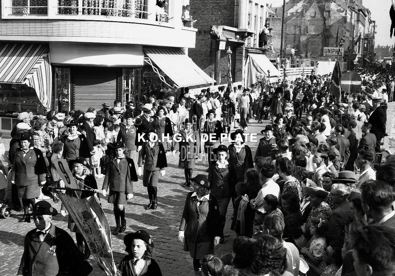 Formaat : 12,5 x 19 cm. - De groep de "Lustige Zigomars" in de Kapellestraat, hoek Ooststraat.