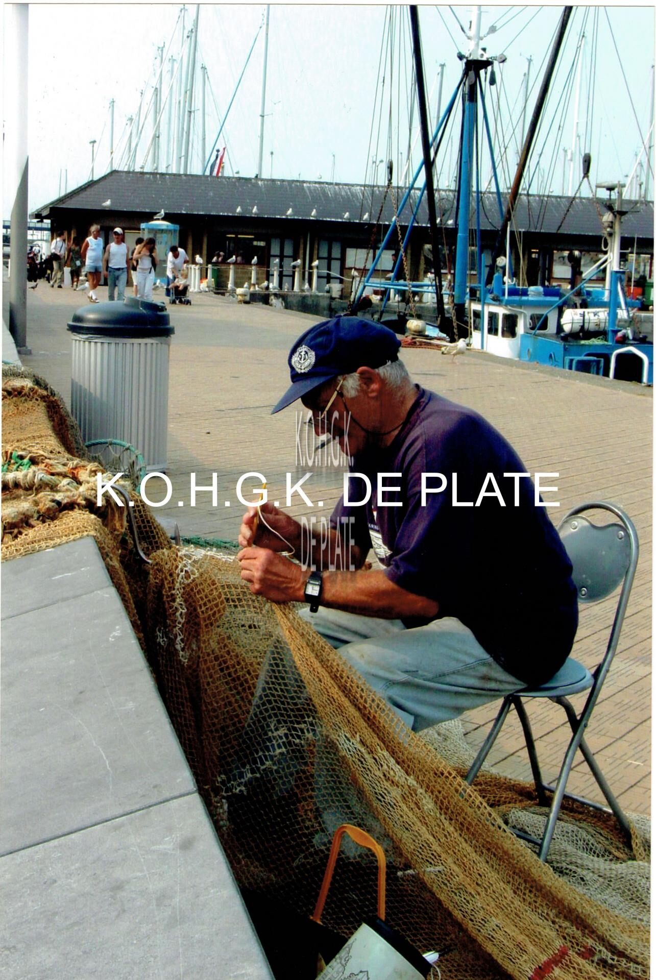 Een visser hersteld zijn visnetten langs de Visserskaai. In de achtergrond zien we de vistrap