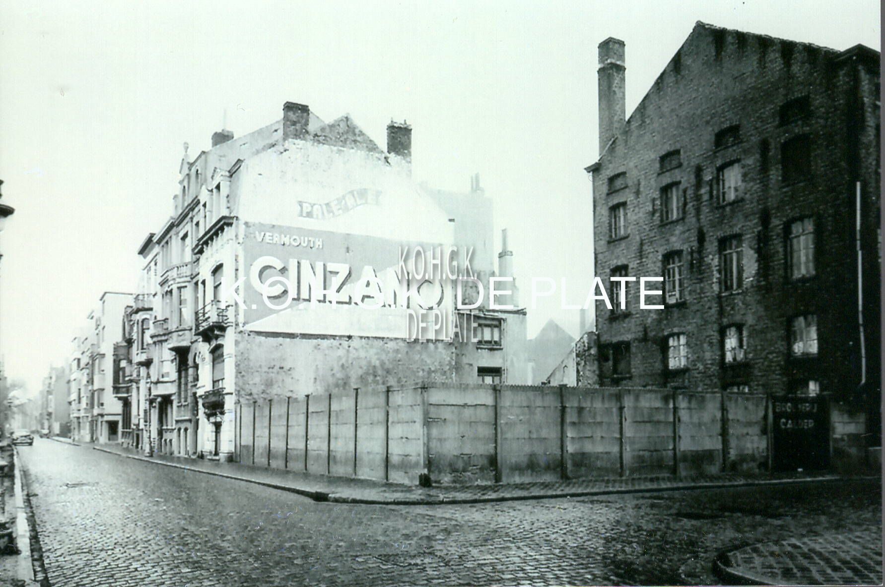 Formaat : 10 x 15 cm. - Links de Wellingstraat en rechts de Frans Musinstraat. Op het braakliggend stuk grond op de hoek, Frans Musinstraat 43-45, staat nu een appartementsgebouw gebouwd in 1970-1972. Op de zijgevel van het eerste huis in de Wellingstraat wordt reclame gemaakt voor Cinzano (Vermouth). Op de poort van de omheining staat Brouwer Calder. De foto werd genomen vòòr 1965