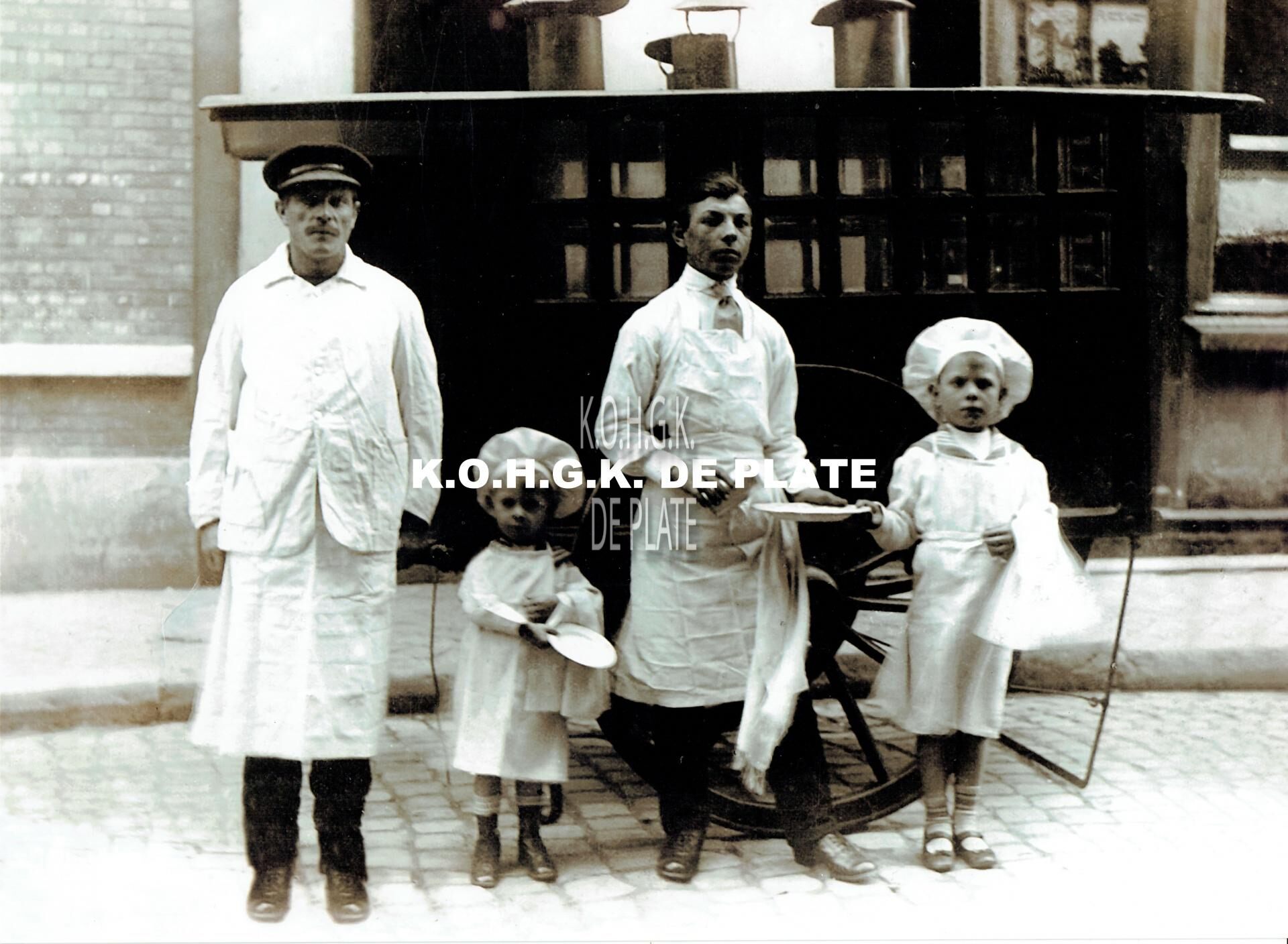 Formaat : 20 x 27 cm. - Frietkar voor Dancing Valentino op de Groentemarkt. - We zien helemaal links Eduard Geselle, rechts naast hem René Geselle, dan Georges Geselle die later uitgeweken is naar de Verenigde Staten en rechts van hem Camiel Geselle