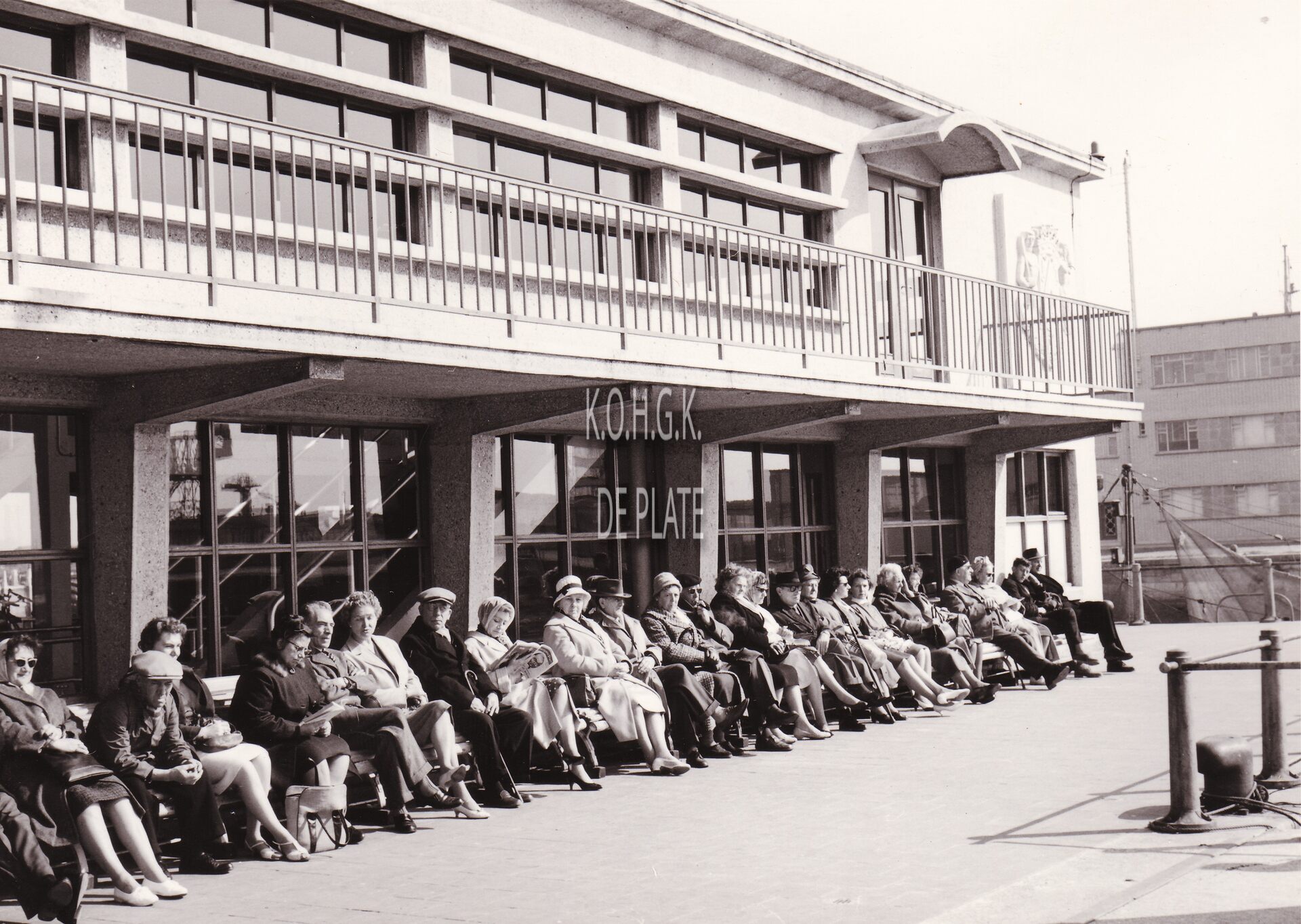 Formaat : 13 x 18 cm. - Mensen genietend van de zon aan de zijgevel van de garnaalmijn aan de Visserskaai.