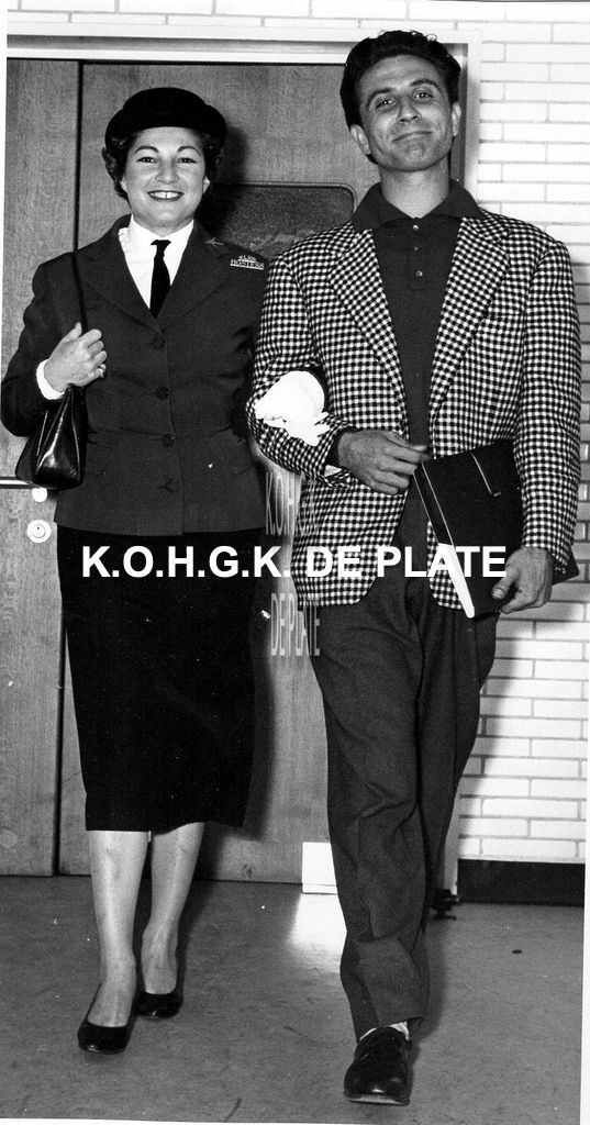 Formaat : 14 x 24,5 cm. - Gilbert Bécaud in het gezelschap van een hostess van de Expo 58.