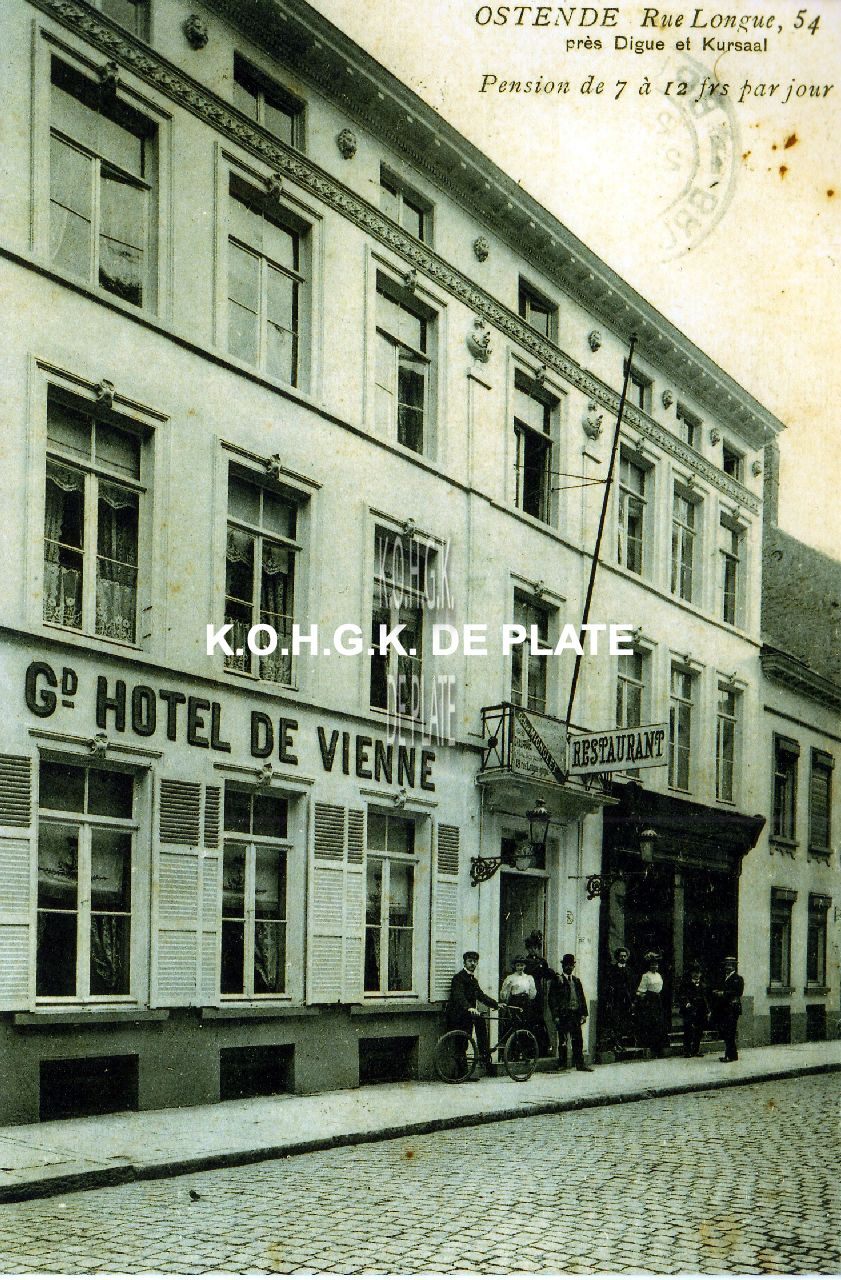 Afdruk.- Formaat : 19 x 12.5 cm. Langestraat 54 : Grand Hôtel de Vienne werd uitgebaat door Hector Vindevogel. Hier werd de geschiedenis van de Oostendse cinema's geschreven. In 1907 werden in de feestzaal van het hotel de eerste filmvoorstellingen gegeven. De grote zaal werd omgevormd tot cinema en op 4 juni 1908 geopend met films van "Cinéma Pathé Frères". Zo is Cinema Pathé geboren. Het gebouw veranderde van eigenaar en het hotel heette toen Hôtel Concordia. In 1932 veranderde de naam van de cinema in Rio Ciné tot 1952, waarna het na veranderingswerken van 1952 tot de sluiting in 1985 Plaza heette. Het hotel heette toen Hotel Oxford. Het gebouw werd gesloopt in 1991 en er kwam een appartementsgebouw voor in de plaats.