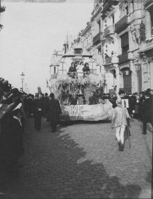 8 foto's : (1 en 2) De Vaste Ring (Antwerpen) met praalwagen en groep : Le Royaume des Gnomes. Op de Zeedijk (1) en op de hoek van de Louisastraat en de Van Iseghemlaan (2) ; (3 en 4) De Jonge Turners (Oostende) : Expansion Coloniale ; (5) Praalwagen van Le Rat Mort : Le Chart du Rat Mort ; (6) Char des Reines de la Mi-Carême de Paris ; (7) Les 5 parties du Monde en (8). Bij de laatste twee foto's zijn de groepen niet te duiden. De foto's staan in de volgorde zoals de stoet uitging, uitgezonderd de laatste twee. - Map 006 C-17a-h