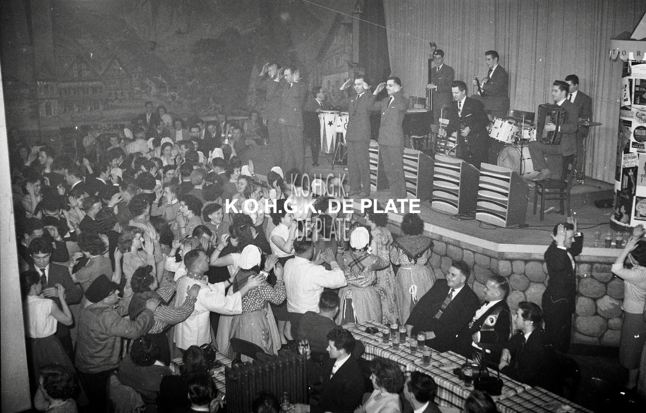 Negatief : 6 x 9 cm. - "Freddy's dansorkest", met Freddy Feys (klarinet) en Will Tura (gitaar). Zittend, tweede van rechts, burgemeester Adolf Van Glabbeke en naast hem Norbert Van der Cruyssen