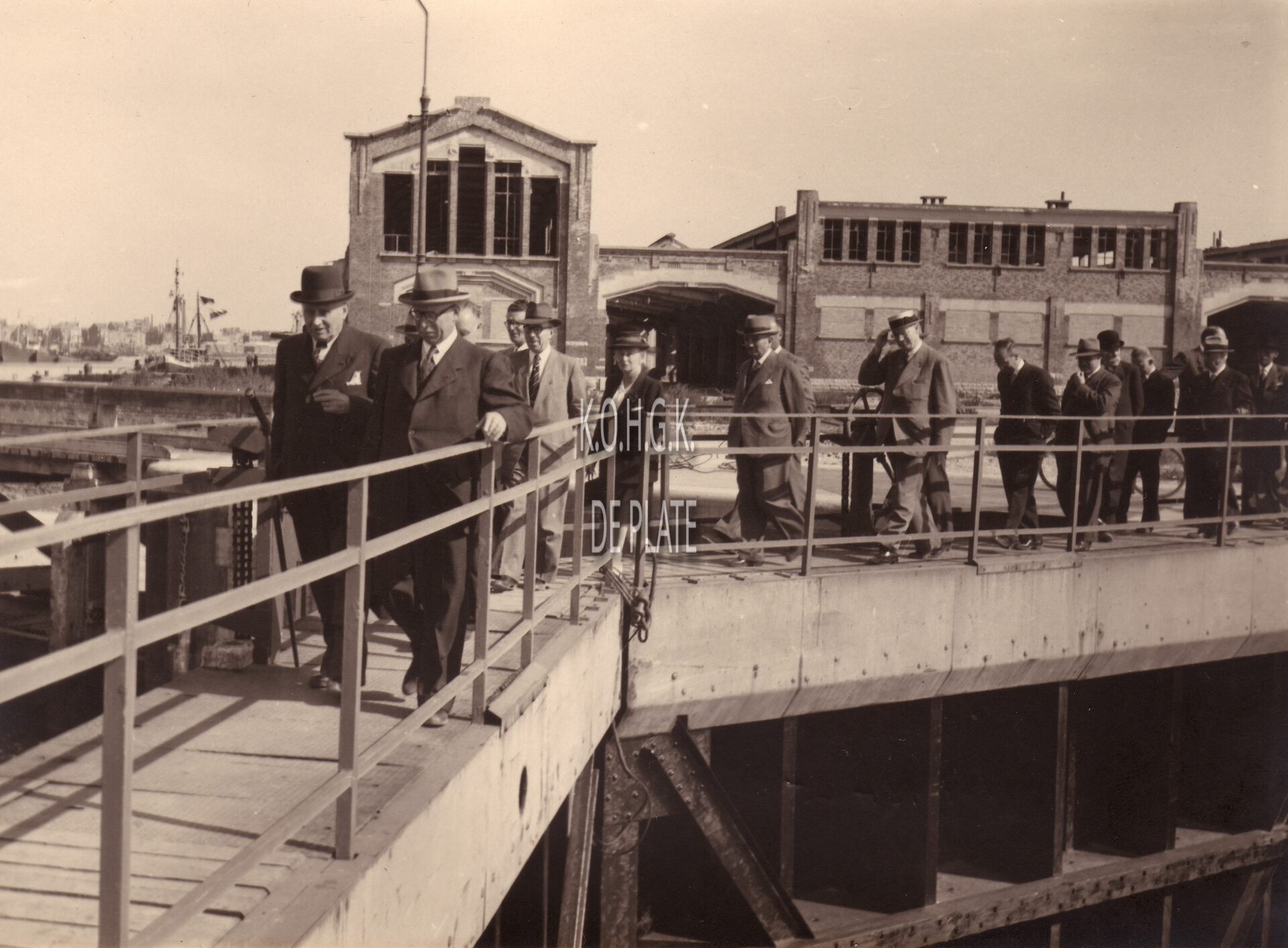 Formaat : 13 x 18 cm. - Burgemeester Henri Serruys en de andere notabelen steken de sluizen over van het Visserijdok na een bezoek aan de vernielde Vismijn kort na de Tweede Wereldoorlog. Met strohoed, stadssecretaris Michel Surmont.