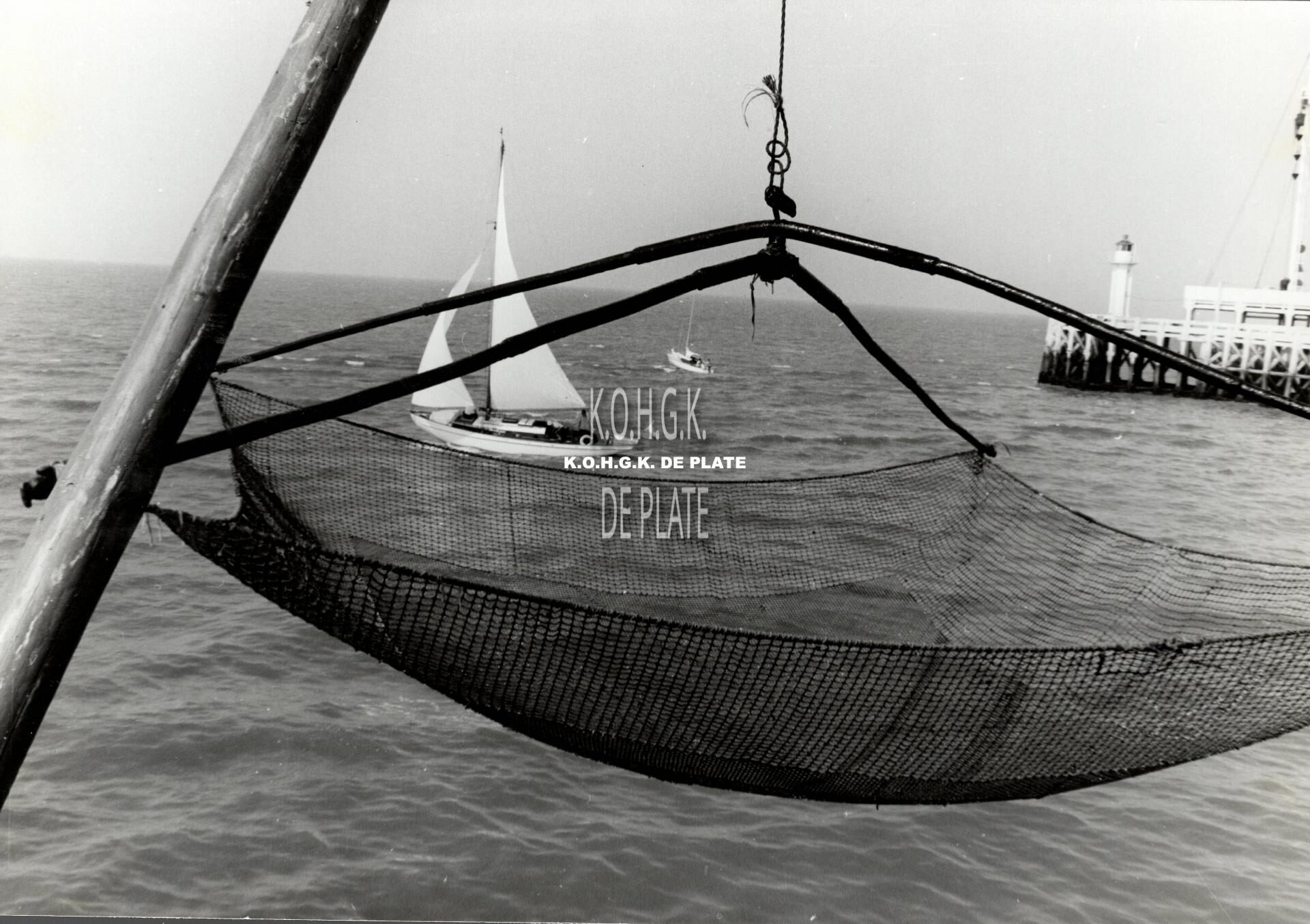 Formaat : 12;5 x 18 cm. - Een jacht in de havengeul. Rechts, het Ooststaketsel met tijseinpost. Het is lange tijd een traditie geweest dan men op het einde van het Weststaketsel kon vissen met een kruisnet. Een attractie voor de toeristen in de hoop een krabbetje of visje te verschalken.