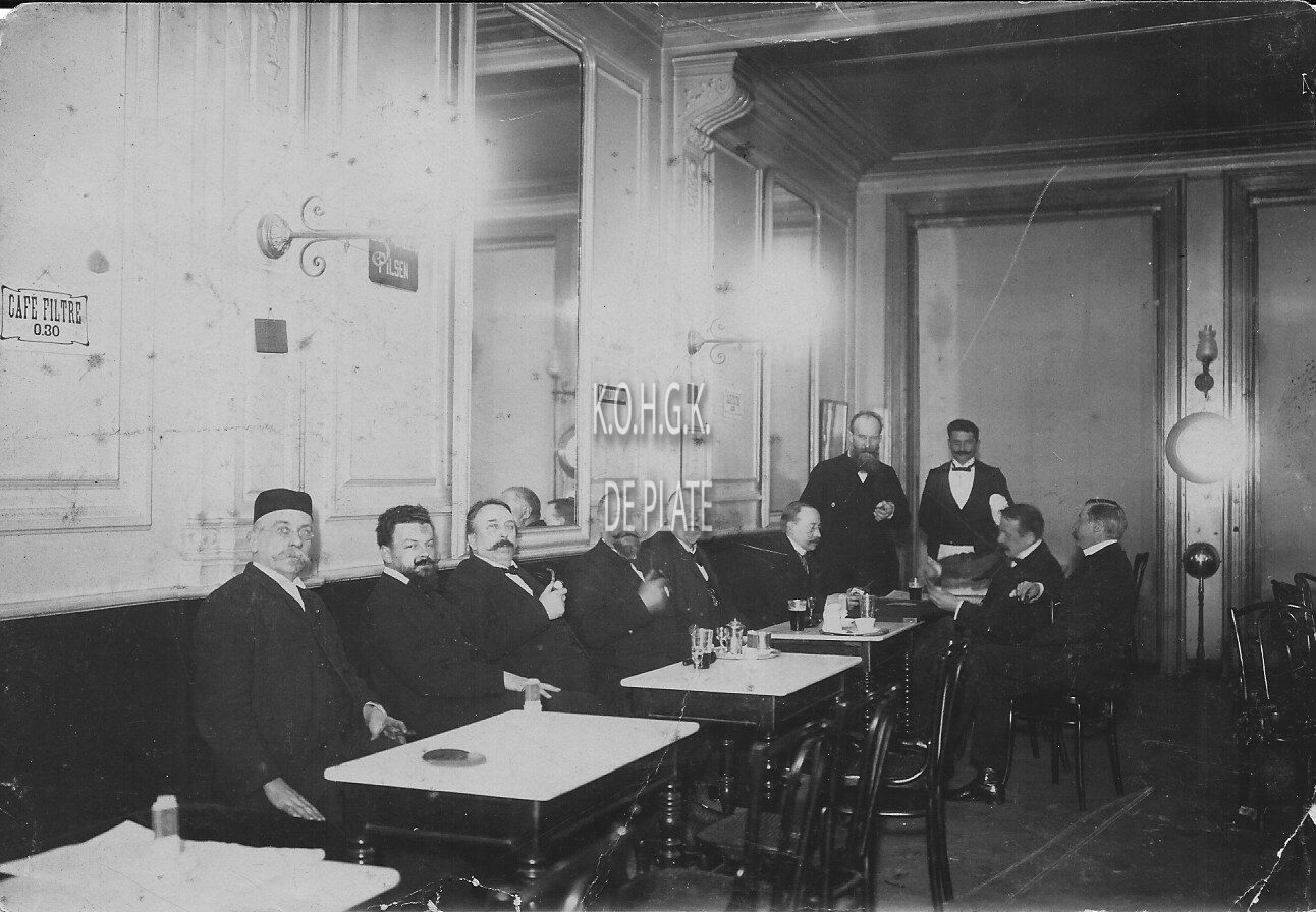 Formaat : 11 x 17 cm. - Mannen met snorren en baarden, een pijp rokend, genieten van een "café filtre" aan 0.30 fr., of kaartspelen met een pint. - Map 006 A-58