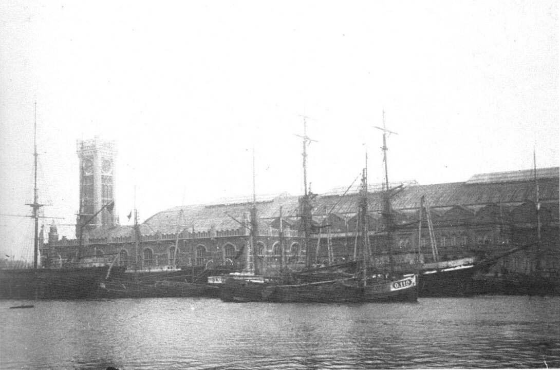 Schepen gemeerd aan het tweede handelsdok. Op de achtergrond het oude Station, in 1881 gebouwd in Engels-Gotische stijl, naar de plannen van architect Felix Laureys. Het werd afgebroken in 1956