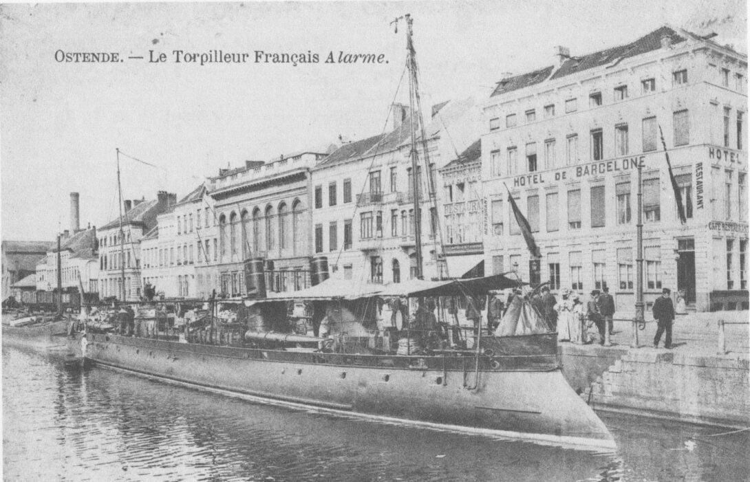 Het Frans oorlogsschip, de torpilleur Alarme, op bezoek te Oosende. Op de achtergrond een gedeelte van de Keizerskaai, thans Vindictivelaan, vanaf de Werfstraat (links) tot de Kapellestraat (rechts), met centraal het Onze Lieve Vrouw College.