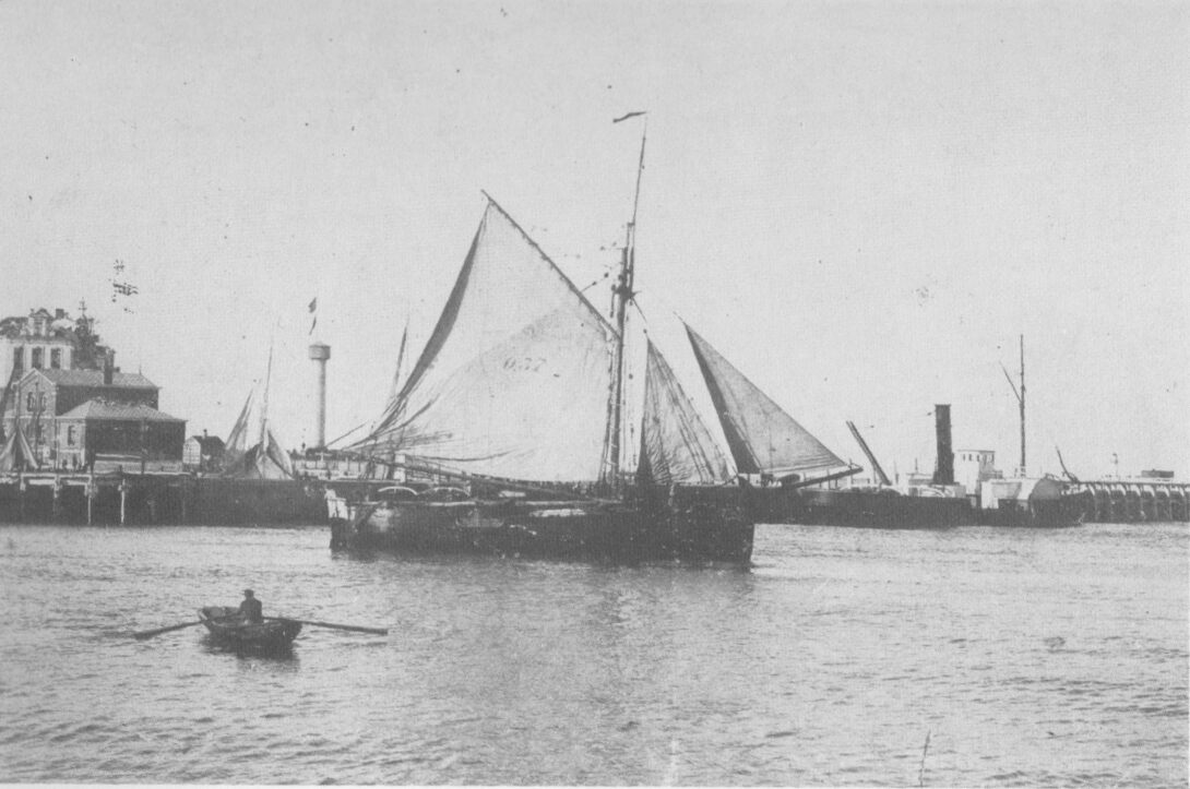 We zien een vissersvaartuig in de havengeul. Links het gebouw van de bestendige reddingsdienst, de eerste vuurtoren (de vlaggestok) en een raderboot gemeerd aan het Weststaketsel