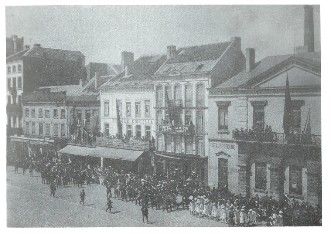 Het Noorderlijk gedeelte van het Wapenplein. Van rechts naar links : De Stadsbibliotheek, het "Hotel Du Damier", de "Cercle Coecilia, "The Falstaff" en "Les Grandes Galéries Belges". Een stoer trekt voorbij.