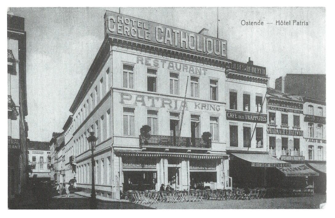 Ostende. Hôtel Patria. De oostkant van het Wapenplein, met links de Brabantstraat. Het hotel-restaurant "Patria", "Café des Trappistes" en Pharmacie E. Halewyck