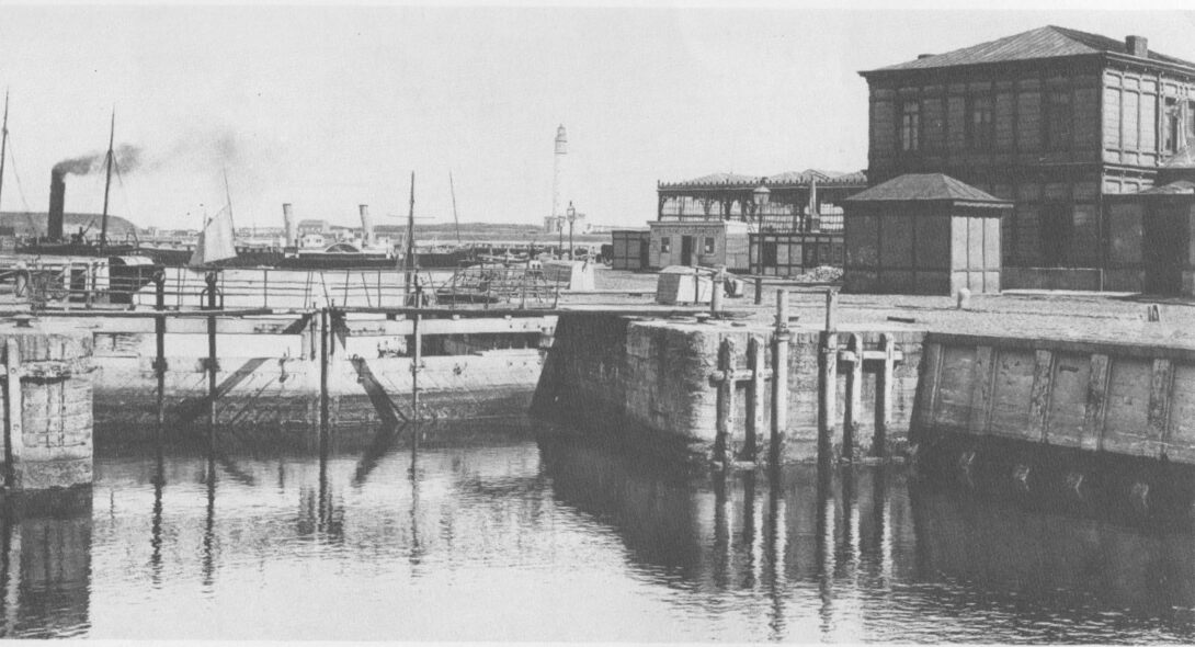 Zicht van de voorhaven met de sluis naar de handelsdokken. Rechts het Zeestation, in de volksmond de "Débarcadère" genoemd. Uiterst links op de achtergrond, het verdedigingswerk "De Halve Maan". Centraal de tweede vuurtoren, gebouwd in 1859
