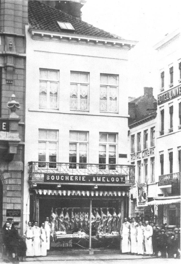 De beenhouwerij Ameloot, op de hoek van het Wapenplein en de Weststraat. Rechts op de foto, de Royal Cinema, bijgenaamd het Vlooienkot, geopend in 1912 en gesloten in 1922. In 1923 werd in dit gebouw het Café Trois Fontaines ingericht.