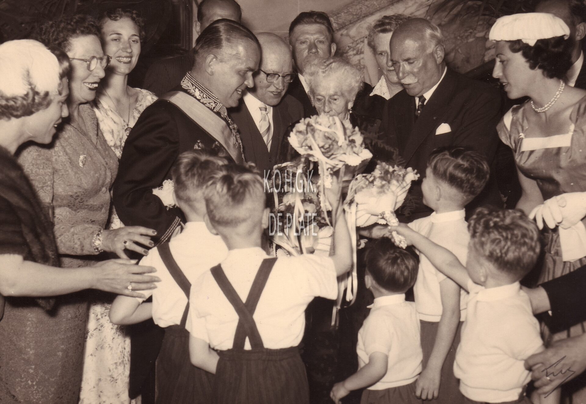 Formaat : 13 x18 cm. - De 100-jarige Mathilde Desmet wordt door achterkleinkinderen (?) in de bloemetjes gezet onder het goedkeurend oog van burgemeester Adolf Van Glabbeke.