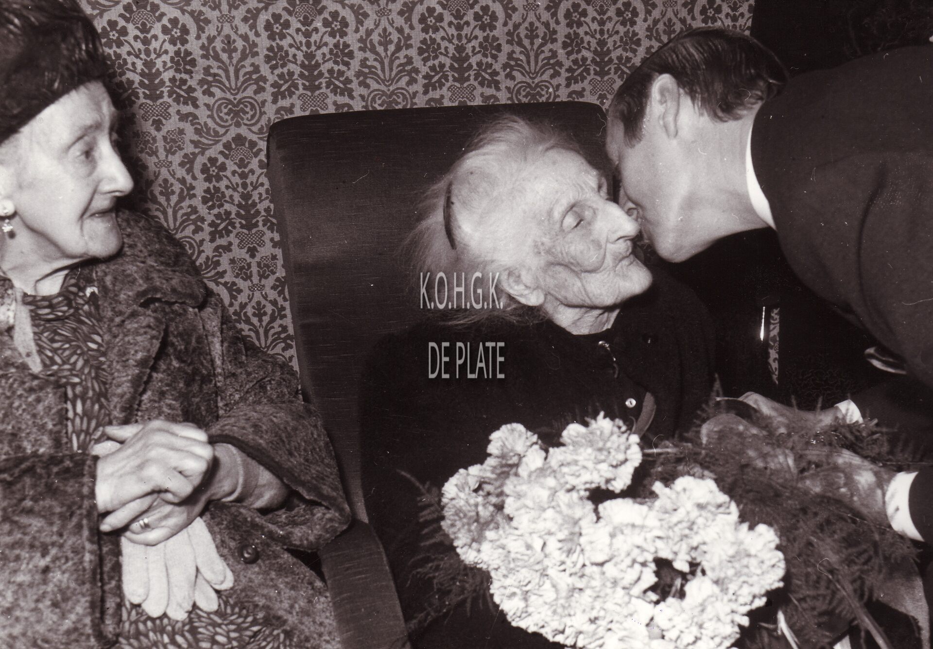 Formaat : 13 x 18 cm. - Burgemeester Jan Piers zet een 100-jarige vrouw in de bloemetjes