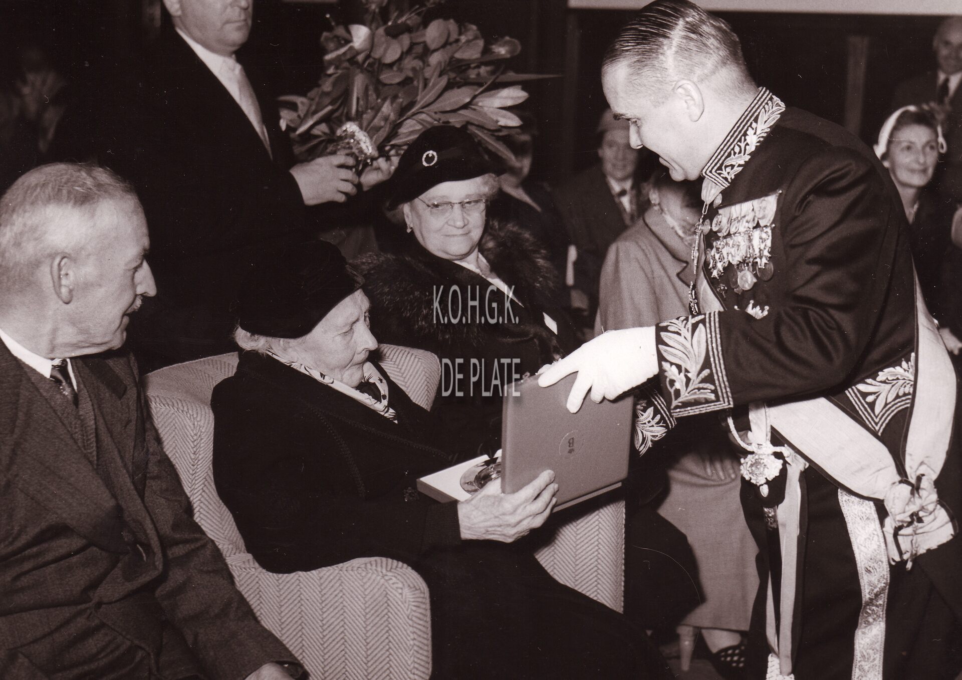 Formaat : 13 18 cm. - Burgemeester Adolf Van Glabbeke overhandigt namens de stad een geschenk aan de 100-jarige Sylvie Fockedey.