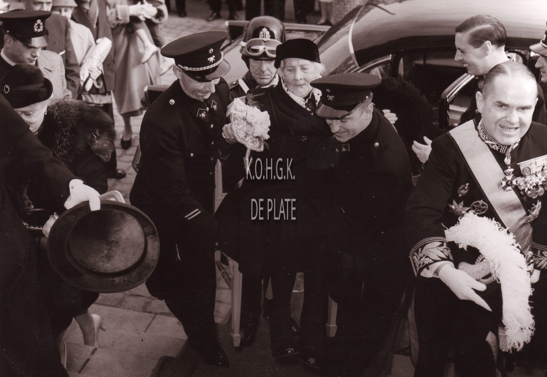 Formaat : 13 x 18 cm. - De honderdjarige Sylvie Fockedey die niet meer goed te been is, wordt door brandweerlui binnengedragen in het stadhuis. Vooraan burgemeester Adolf Van Glabbeke.