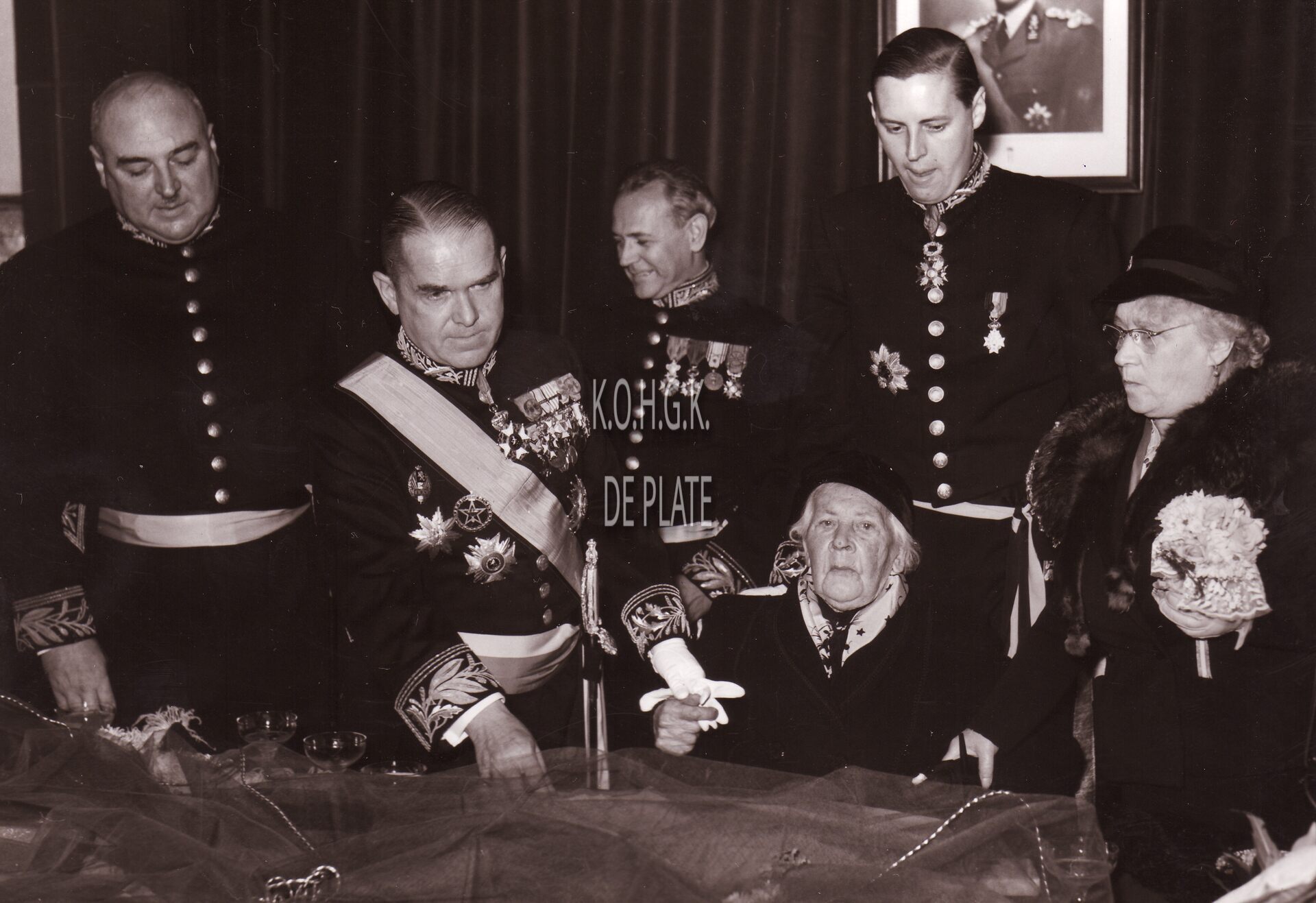 Formaat : 13 x 18 cm. - De honderdjarige Sylvie Fockedey en haar dochter worden plechtig ontvangen op het stadhuis. Links schepen Maurice Quaghebeur (sr.) en burgemeester Adolf Van Glabbeke, achter de jarig staat schepen Jan Piers.