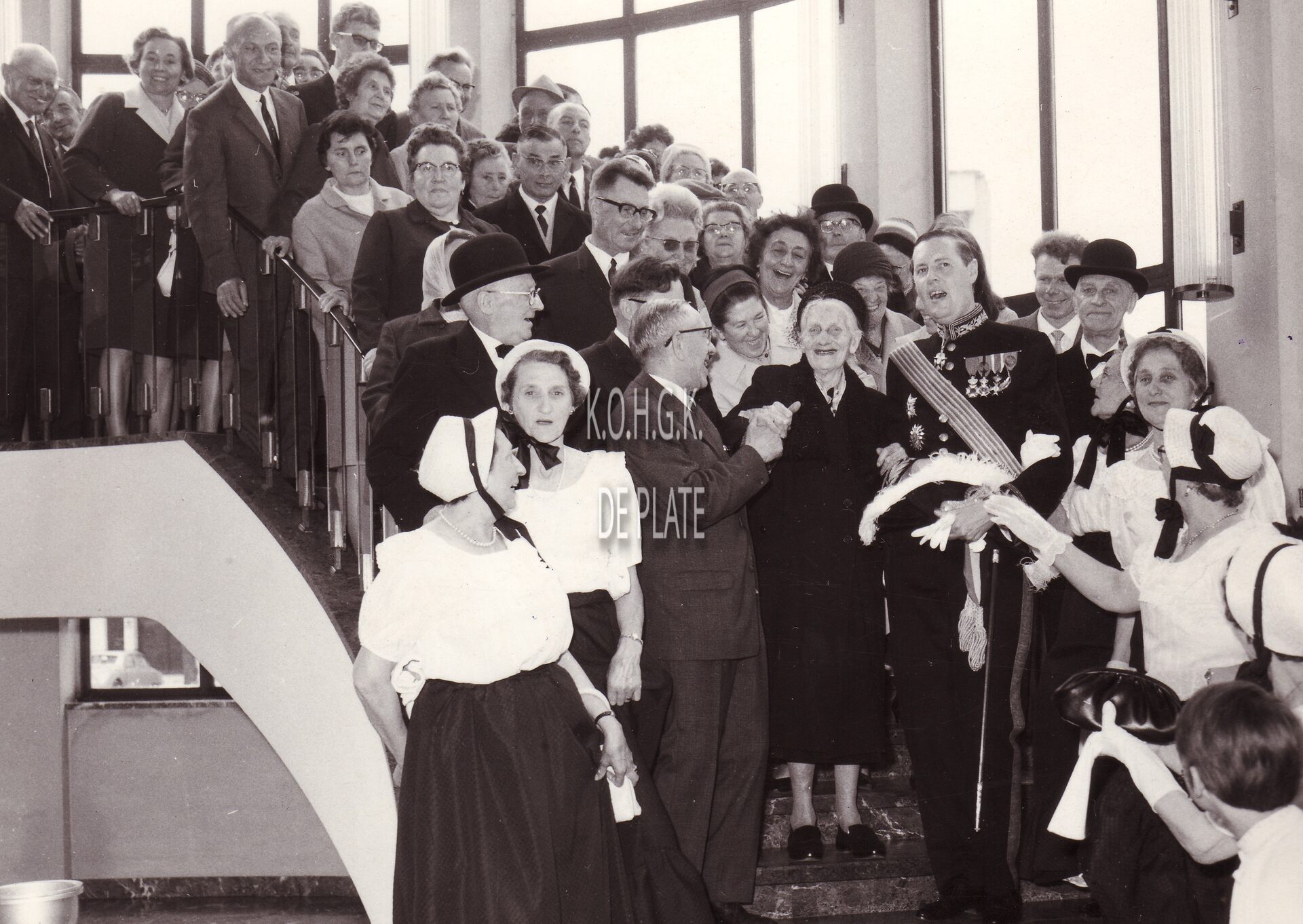 Formaat : 13 x 18 cm. - Een honderdjarige samen met haar familie op de trappen in het stadhuis, waar ze door burgemeester Jan Piers ontvangen werden.