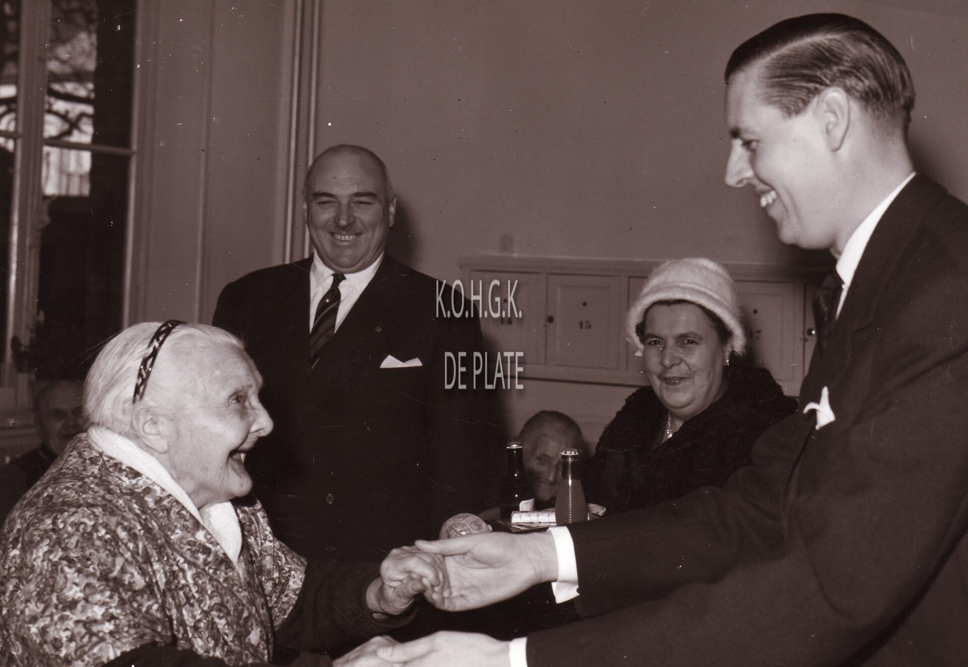 Formaat : 18 x 13 cm. - Burgemeester Jan Piers haalt de jarige af bij haar thuis.