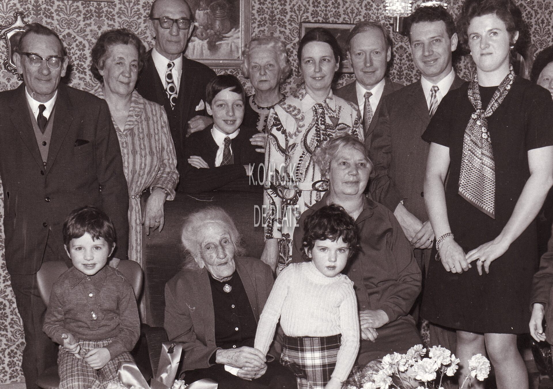 Formaat : 13 x 18 cm. - Een 100-jarige vrouw te midden van haar nakomelingen