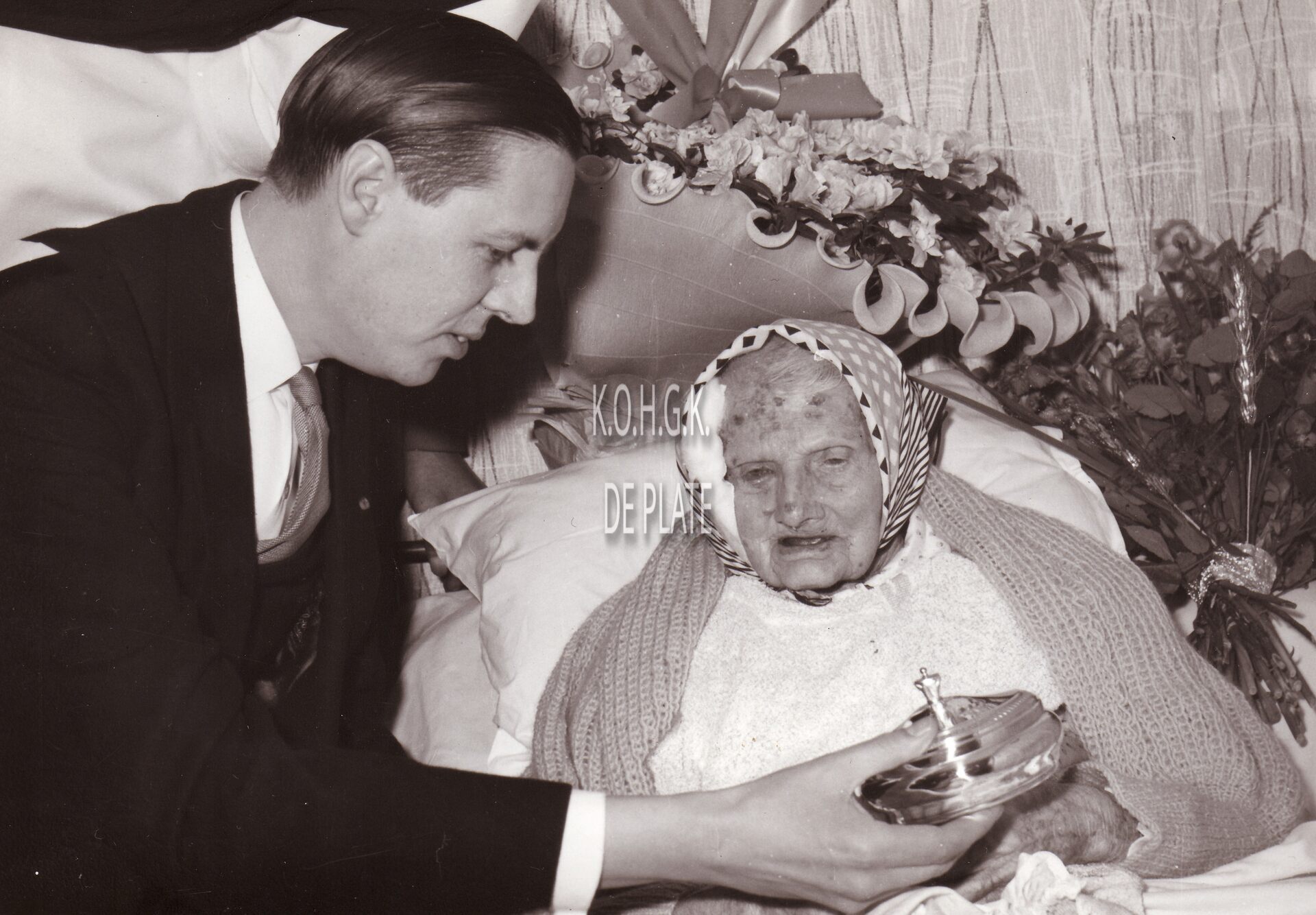 Formaat : 13 x 18 cm. - De 100-jarige Eugenie Vermeersch beter gekend als meetje Lingier. heeft burgemeester Jan Piers op bezoek die haar namens de stad een geschenk overhandigd. Meetje Lingier woonde in de Voorhavenlaan op de Vuurtorenwijk.