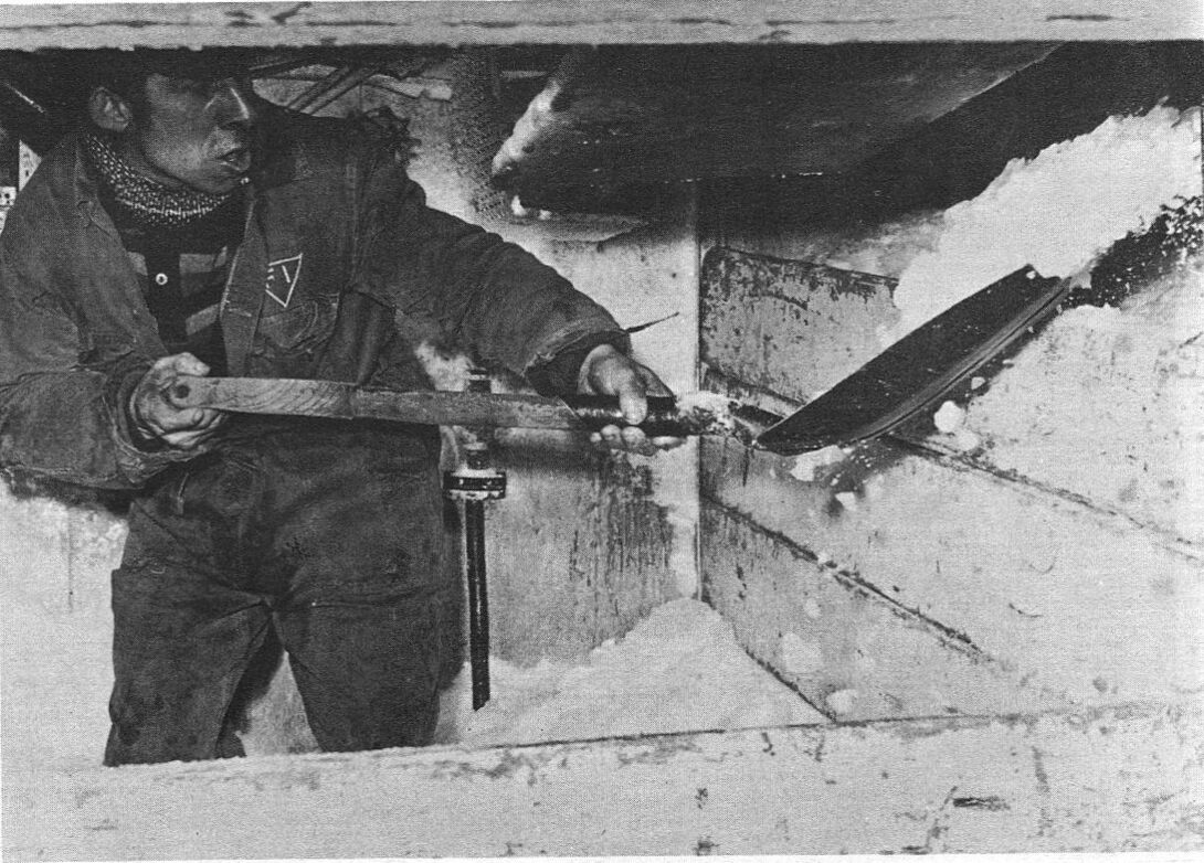 Het vissersvaartuig wordt bevoorraad met ijs, dat in het ruim in afzonderlijke vakken wordt bewaard. - Map 023 A-50