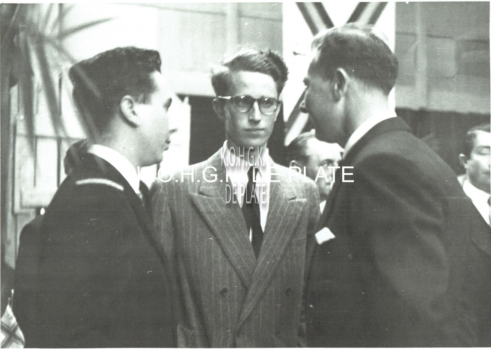 Vergroting. - Formaat : 30 x 40 cm. - Koning Boudewijnin gesprek tijdens de inhuldiging van de Vismijn. De officier naast de koning is Daniël Geluyckens (ordonnanceoffiier van 1950-1959).