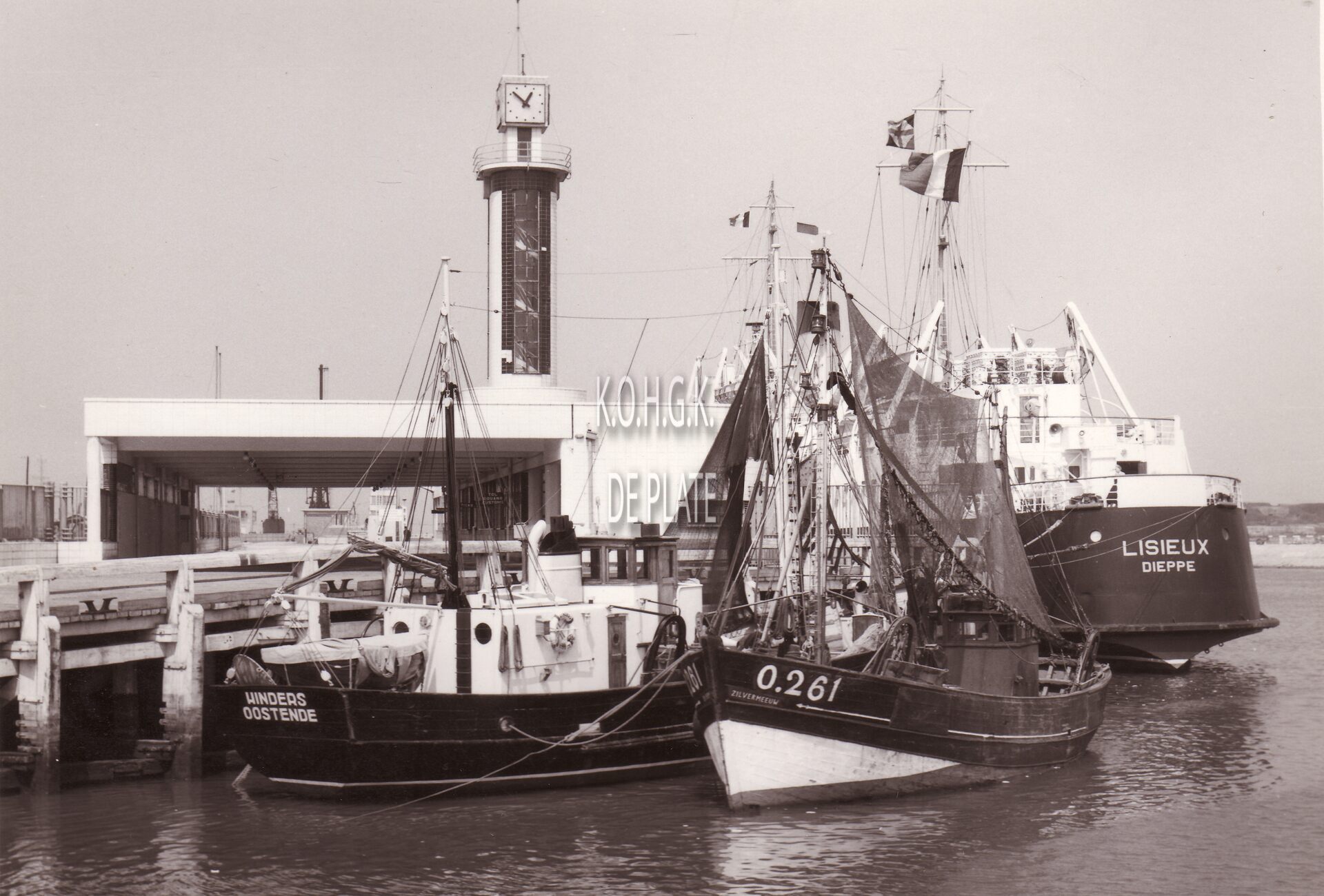 Formaat : 13 x 18 cm. - Het inschepingsgebouw voor de carferry's. De Franse carferry Lisieux uit Dieppe ligt aan de kaai. Op de voorgrond twee Oostendse vissersboten. Oorspronkelijk Controlegebouw der Carferry, Natiënkaai 9, naar hetontwerp (1938) van J. De Jong (architect van Bruggen en Wegen), in de trant van de nieuwe zakelijkheid. Bij verregaande verbouwingen in de jaren 1960 onder de leiding van architect H. Denys, werd het voorzien van nieuwe gevelbekleding. Gebouw wordt gedomineerd door de tijtoren, waarop een synoptische schaal aangebracht wordt met automatische aanduiding van de waterstand via speciale verlichting, bovenaan de toren, vlaggemast en grote driezijdige klok