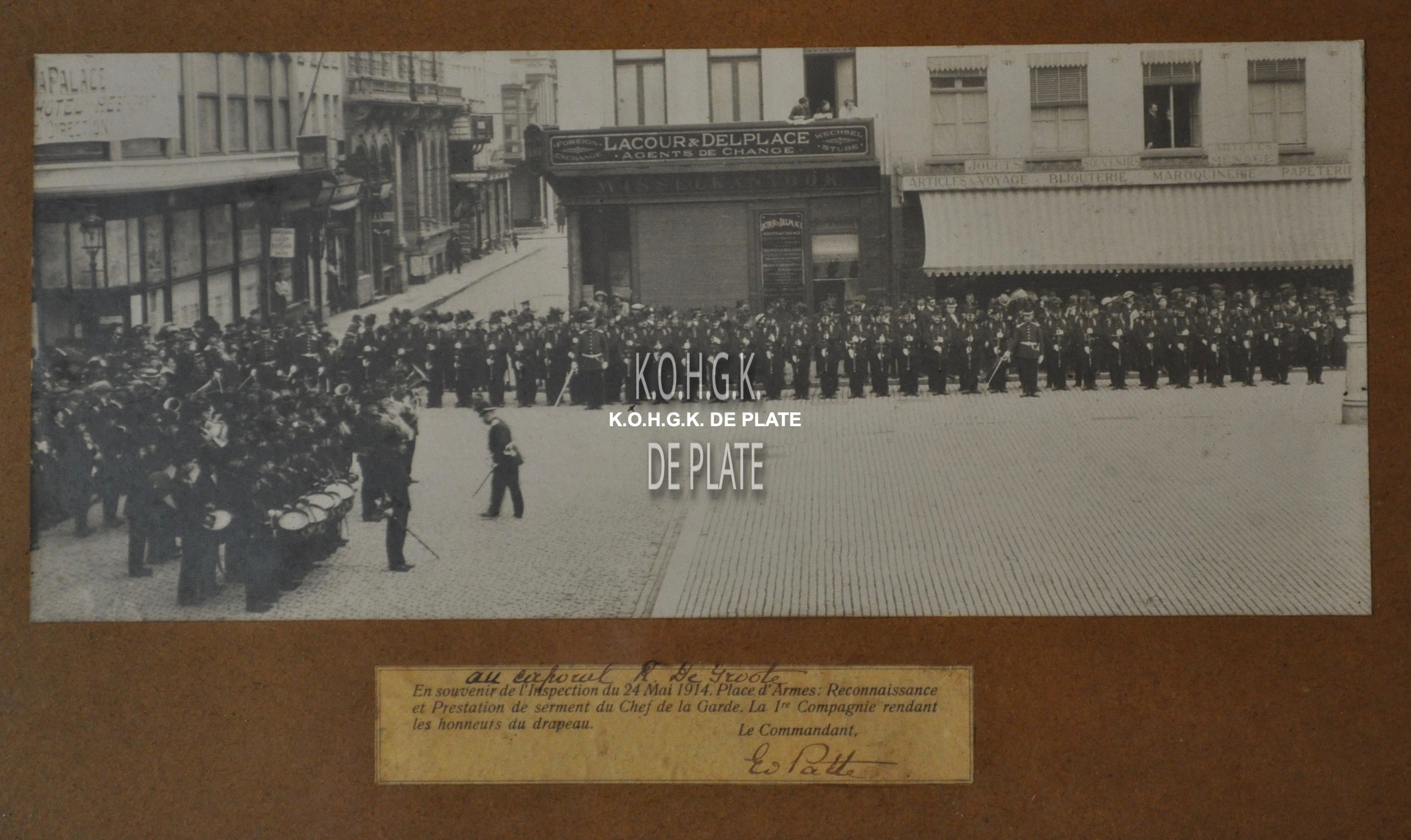 EN SOUVENIR DE L’INSPECTION DU 24 MAI 1914 PLACE D’ARMES : Reconnaissance et prestation dE serment du chef de la Garde. 1er COMPAGNIE RENDANT LES HONNEURS DU DRAPEAUX GETEKEND LE COMMANDANT E.O. PATTE