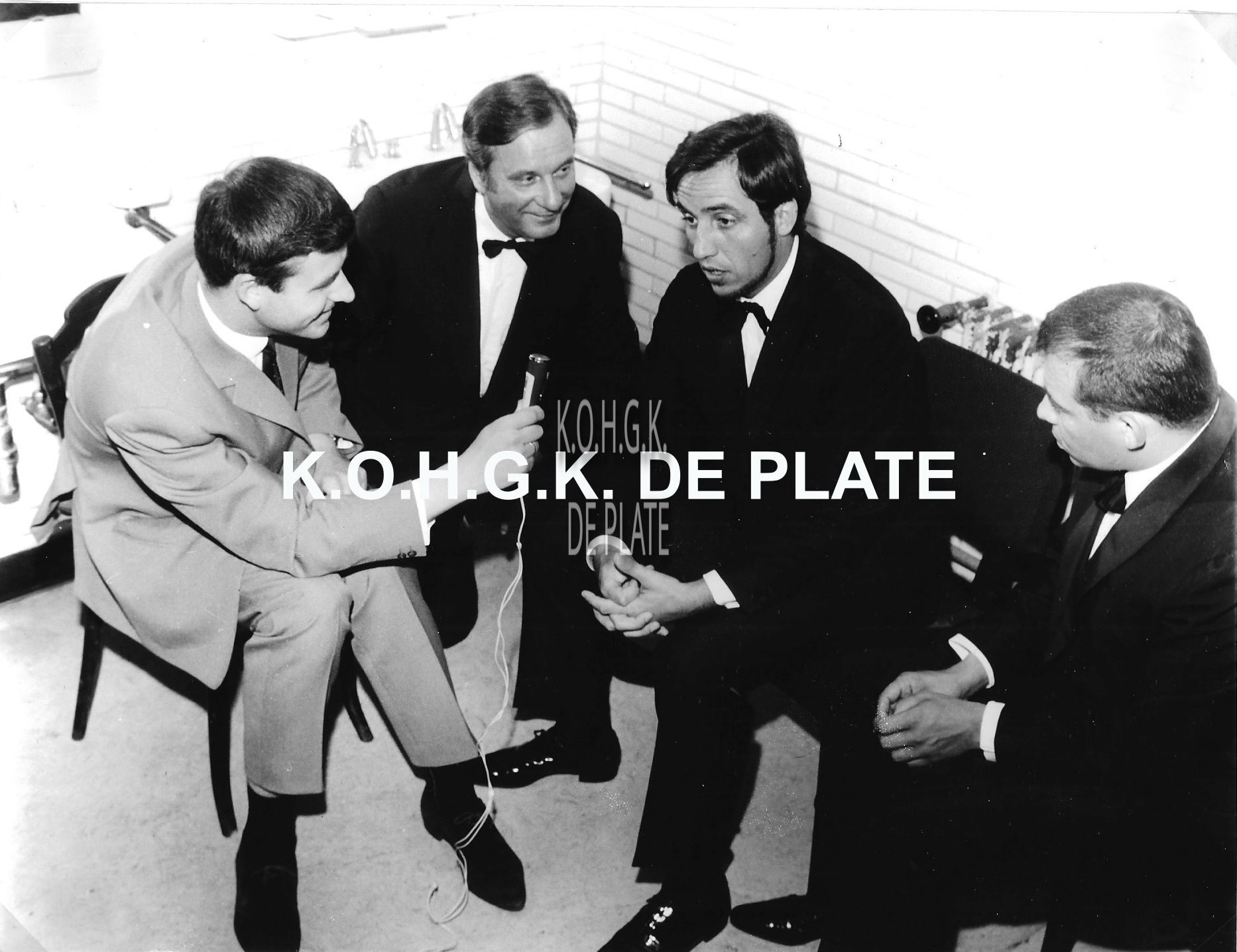Formaat : 18 x 24 cm. - Jacques Loussier in een interview met journalist Stuyck. links, Christian Garros (drums) en rechts, Pierre Michelot (contrabas)