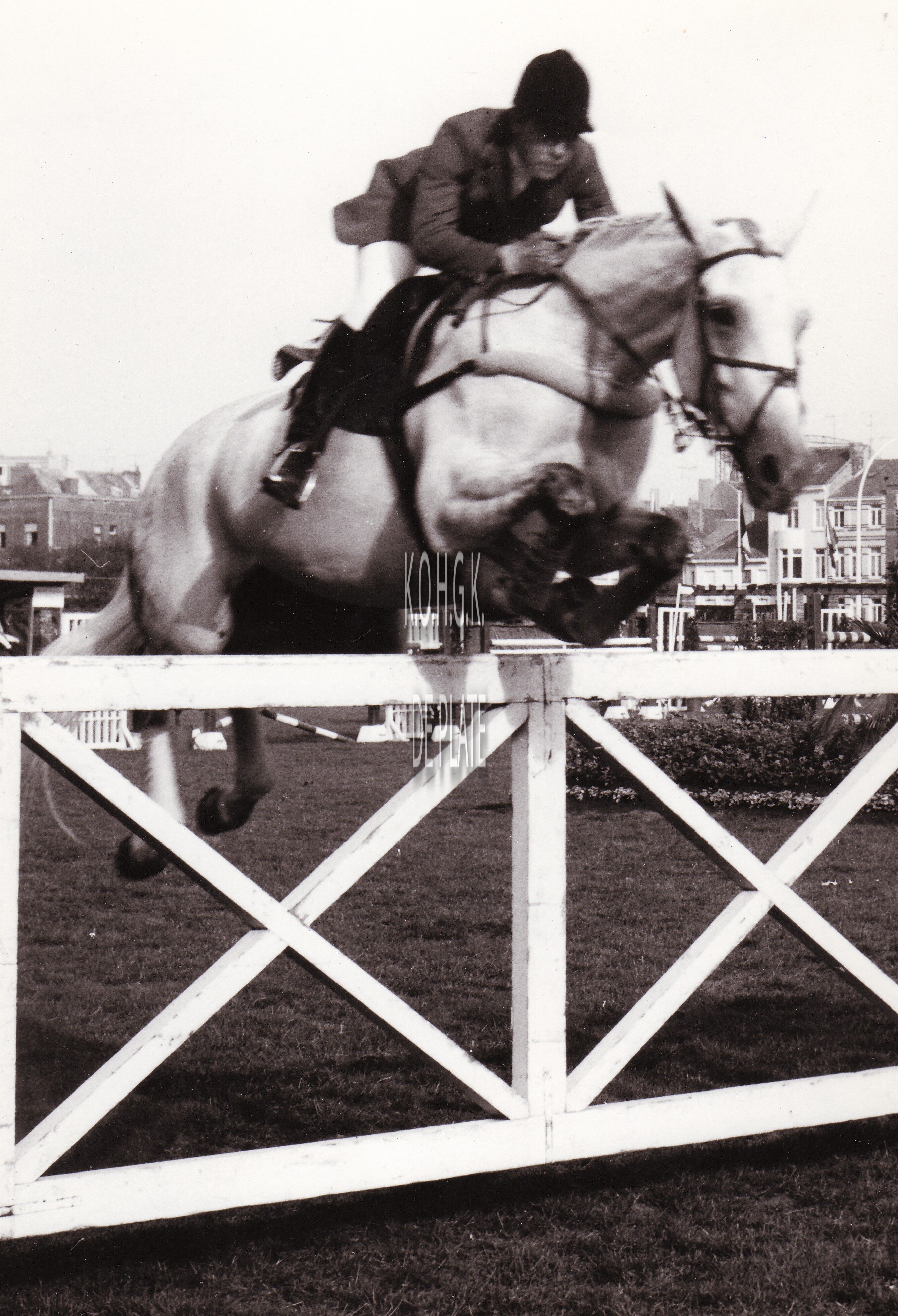 Miss C. HOFMAN en paard neemt een hindernis op een wedstrijd aan de Koningin Astridlaan.Achteraan de pergola rond het terrein en de Wellingtonstraat.