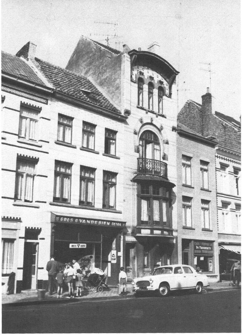 Gedeelte van de Kaaistraat tussen de Ooststraat (links) en de Wittenonnenstraat (rechts). Het groot gebouw, centraat op de foto, en de ernaast gelegen drankwinkel werden rond 1964 gesloopt om plaats te maken voor een modern flatgebouw