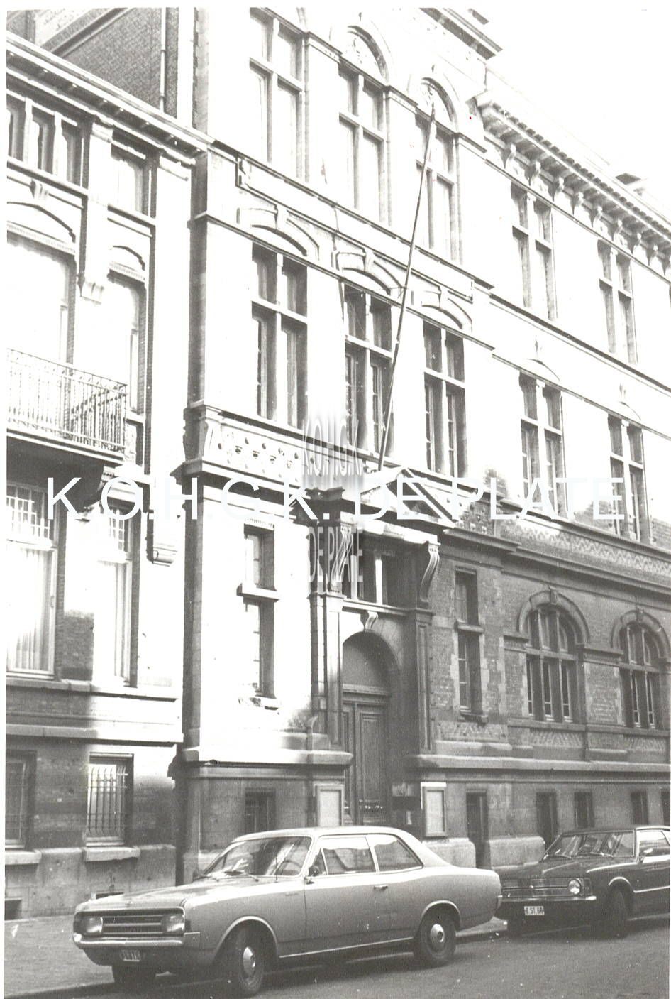 Formaat : 12 x 8 cm. - De kostschool in de Rogierlaan 10-12. - Schoolgebouw opgetrokken in 1900-1901 naar ontwerp van Joseph Caluwaers (atheneum) en Achille Raoux (kostschool); hiervoor worden enkele huizen en de Sint-Jozefskerk (1889) gesloopt.
