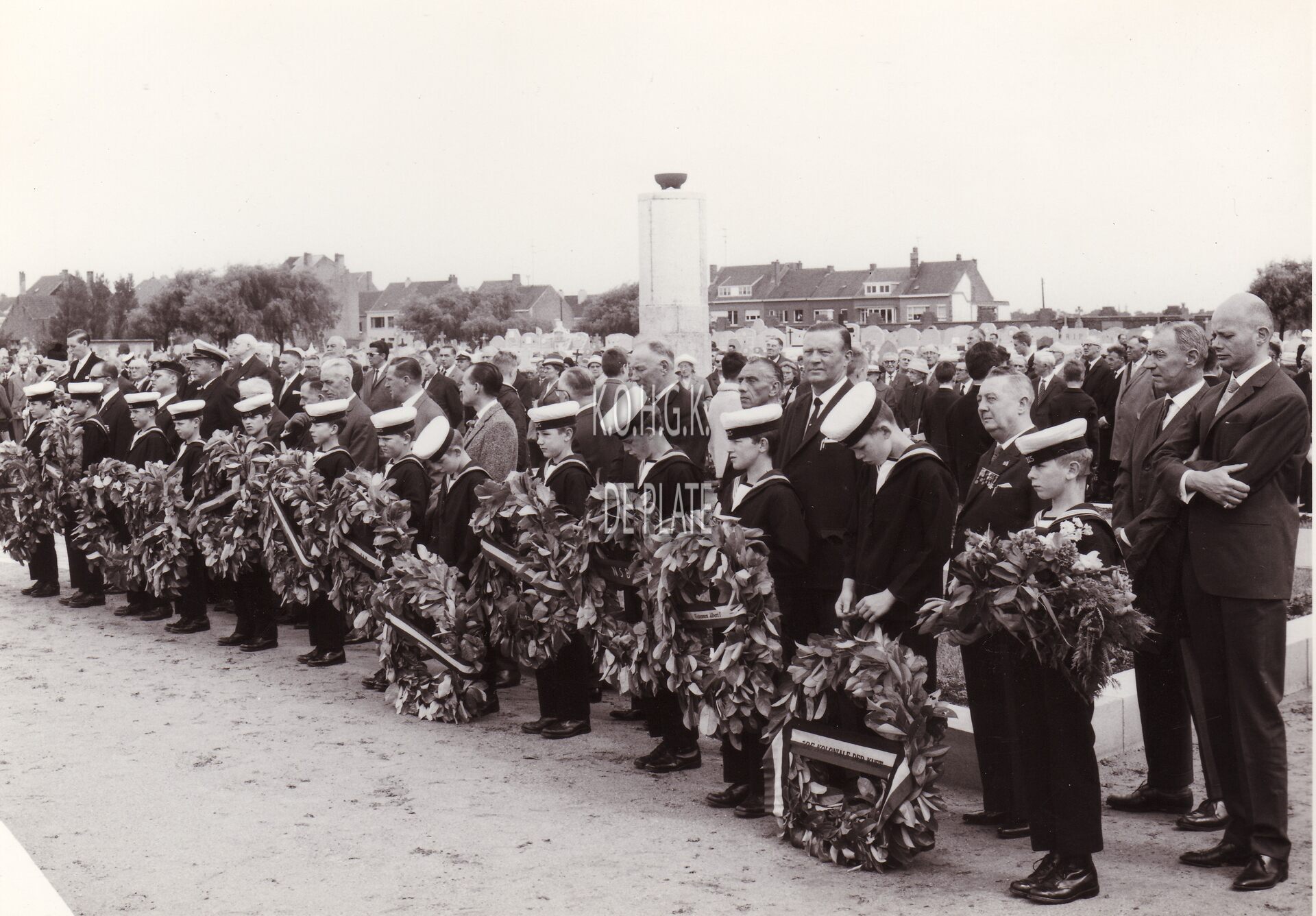 Formaat : 13 x 18 cm. - Leerlingen van de Ibisschool op het kerkhof aan de Stuiverstraat bij een bloemenhulde aan het monument voor de op zee verdwenen vissers.