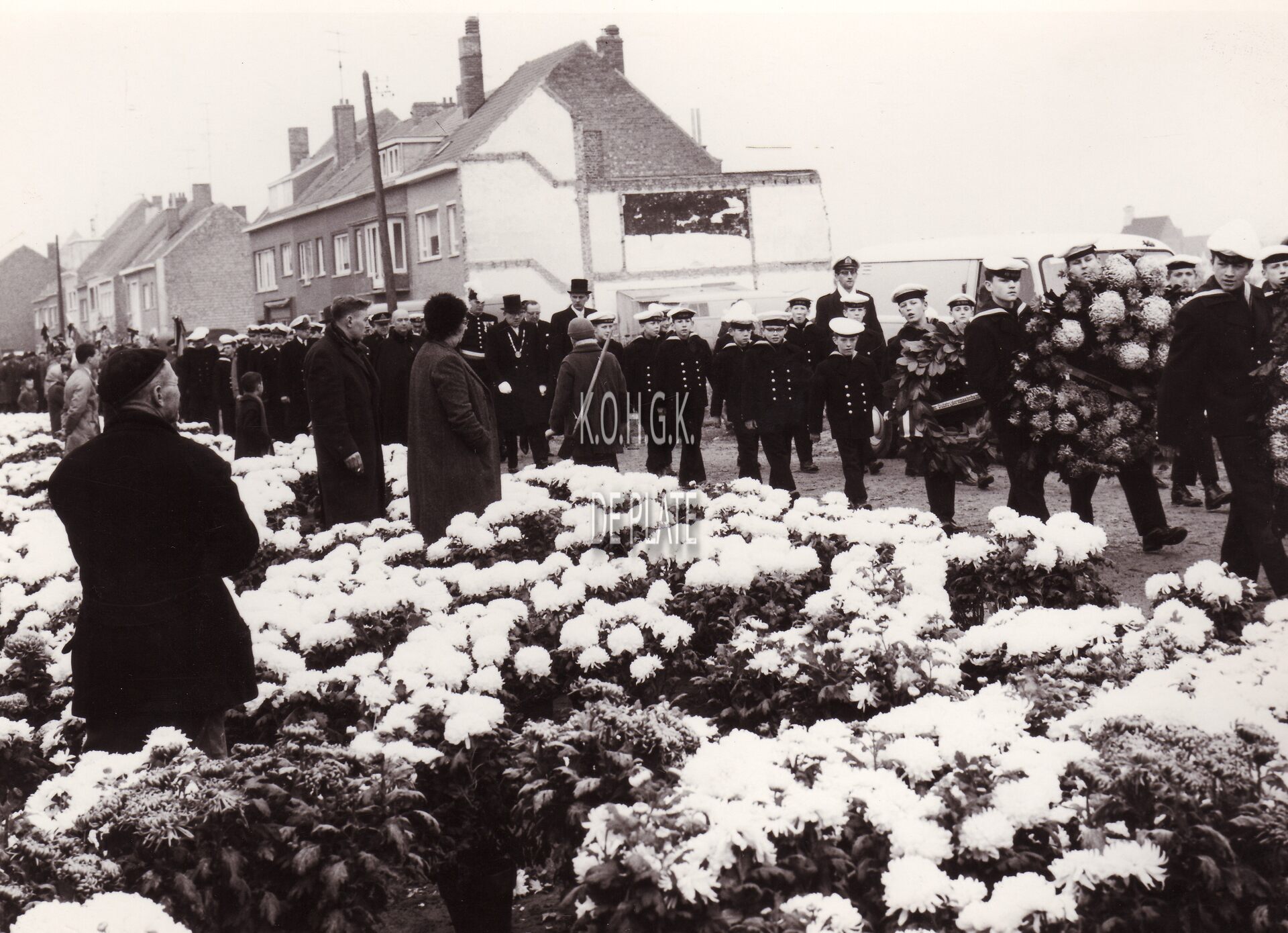 Formaat : 13 x 18 cm. - De leerlingen van de Ibisschool komen toe aan het Kerkhof Stuiverstraat voor de jaarlijkse hulde aan de op zeegebleven vissers,