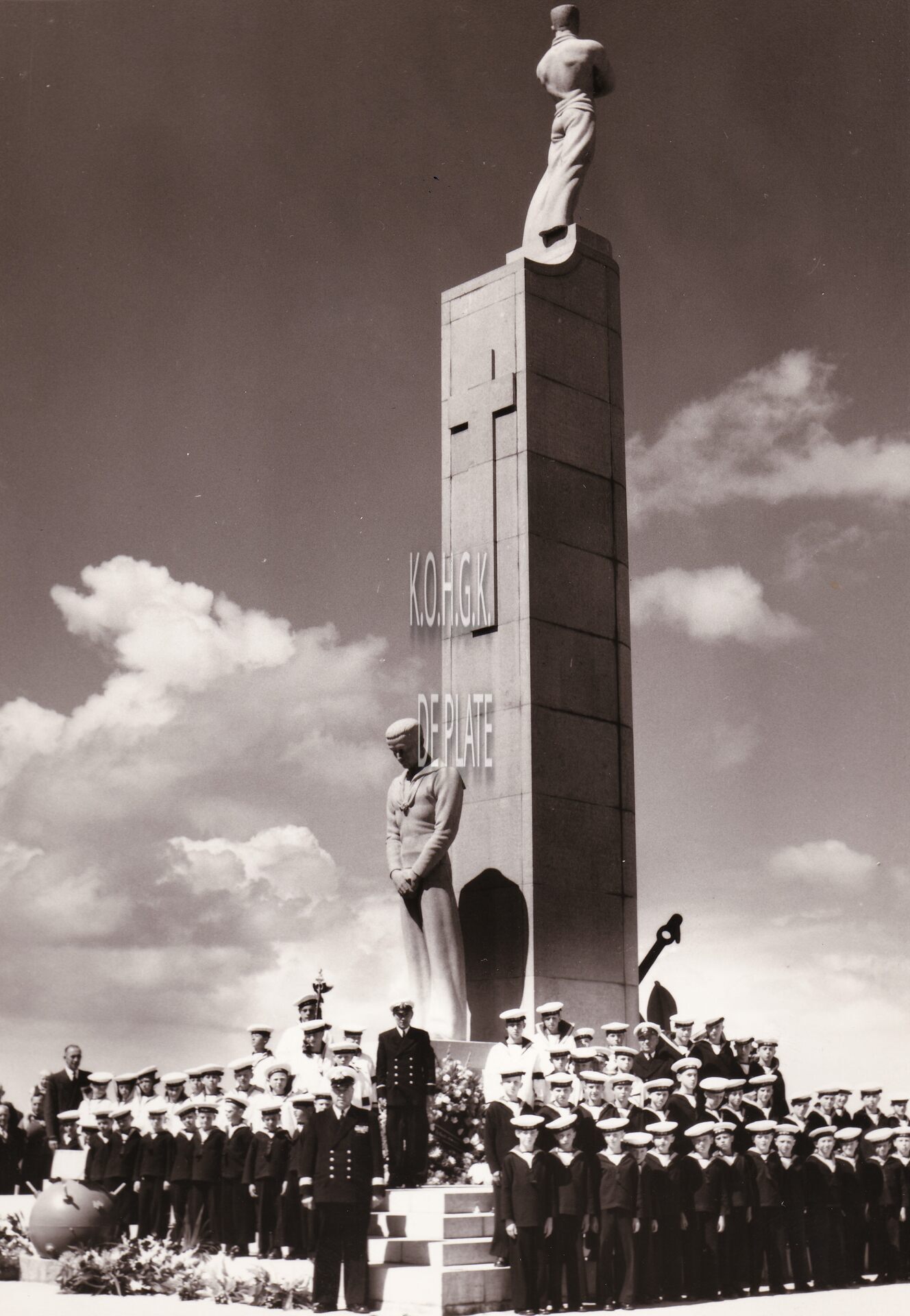 Formaat : 18 x 13 cm. - De leerlingen van het Koninklijk Werk Ibis opgesteld rond het Nationaal Monument voor de Zeelieden op het Zeeheldenplein. Vooraan centraal directeur René David. In het begin sierden enkele ontladen zeemijnen het monument, deze werden in de jaren 1960 verwijderd.