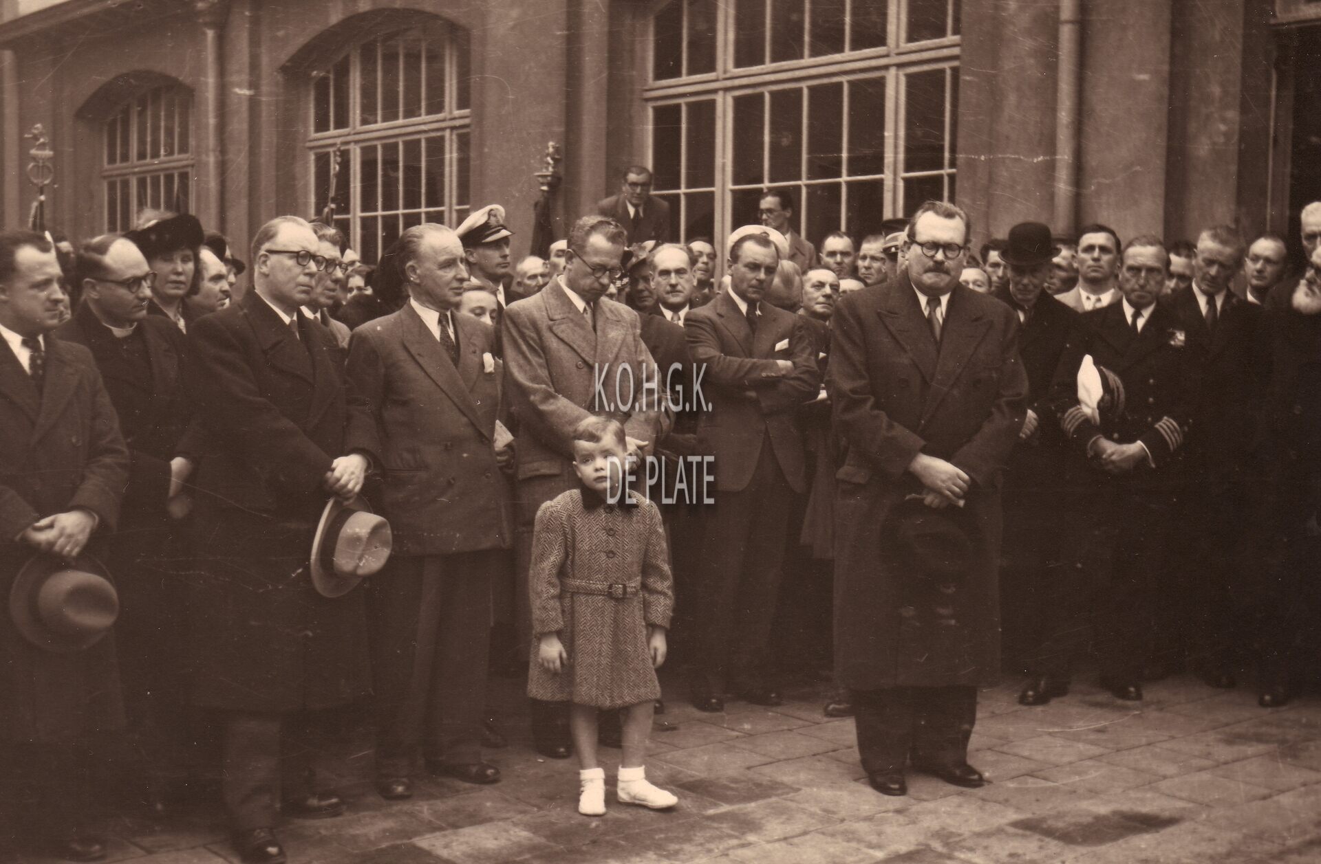 Formaat : 13 x18 cm. - Inhuldiging van een gedenkteken in de Ibisschool. Er wordt een minuut stilte in acht genomen. Vooraan eerste minister Achiel Vanacker, uiterst links burgemeester August Plovie van Bredene met naast hem de burgemeester Hendrik Serruys.
