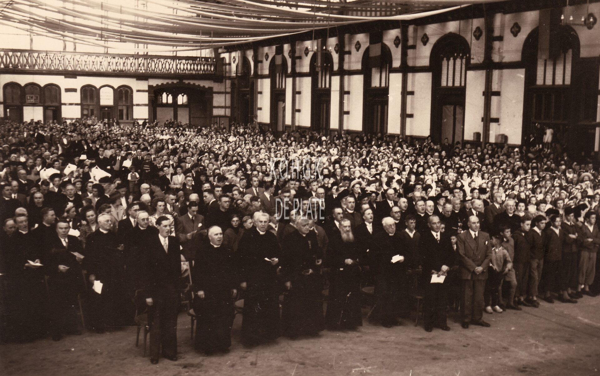Formaat : 13 x 18 cm. - Vooraan helemaal rechts enkele leerlingen van de Ibisschool op de gouden priesterjubileum van Z.J.H. Joseph Desmet in de Albert Hall van het oud stationsgebouw aan het Ernest Feysplein.