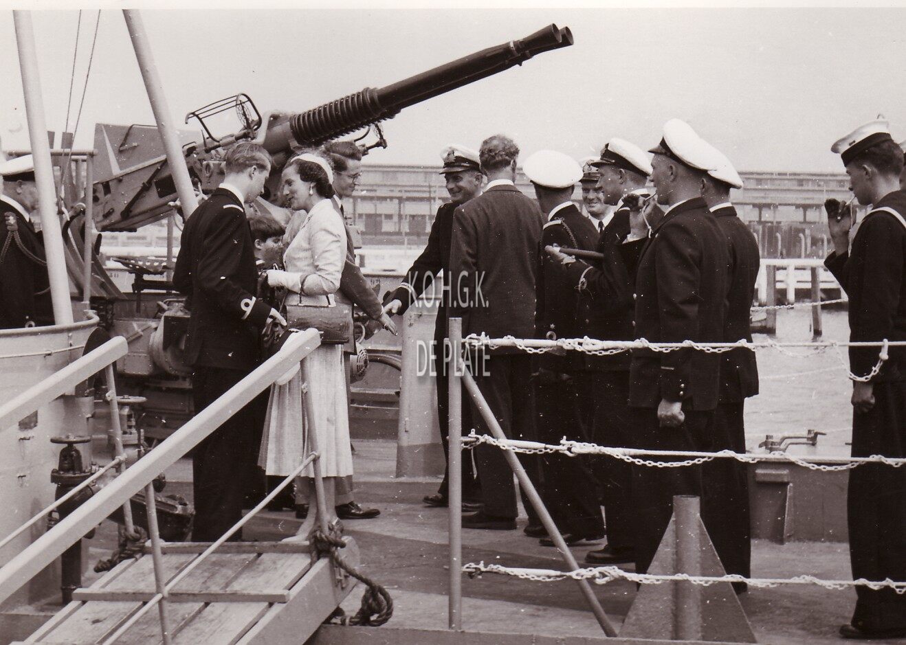 Formaat : 13 x 18 cm. - Prinses Lilian Baels in gesprek met Prins Albert. Naast haar, Prins Alexander en Koning Boudewijn. Ook Koning Leopold III is aanwezig. Op de achtergrond de vismijn.